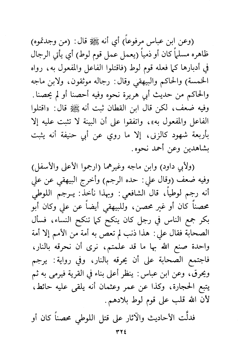 (وعن ابن عباس مرفوعًا) أي أنه - صلى الله عليه وسلم - قال: «من وجدتموه» ظاهره مسلمًأ كان أو ذميًا (يعمل عمل قوم لوط) أي يأتي الرجال في أدبارها كما فعله قوم لوط (فاقتلوا الفاعل والمفعول به، رواه الخمسة) والحاكم والبيهقي وقال: رجاله موثقون، ولابن ماجه والحاكم من حديث أبي هريرة نحوه وفيه أحصنا أو لم يحصنا وفيه ضعف، لكن قال ابن القطان ثبت أنه - صلى الله عليه وسلم - قال: «اقتلوا الفاعل والمفعول به» واتفقوا على أن البينة لا تثبت عليه إلا بأربعة شهود كالزنى، إلا ما روي عن أبي حنيفة أنه يثبت بشاهدين وعن أحمد نحوه.