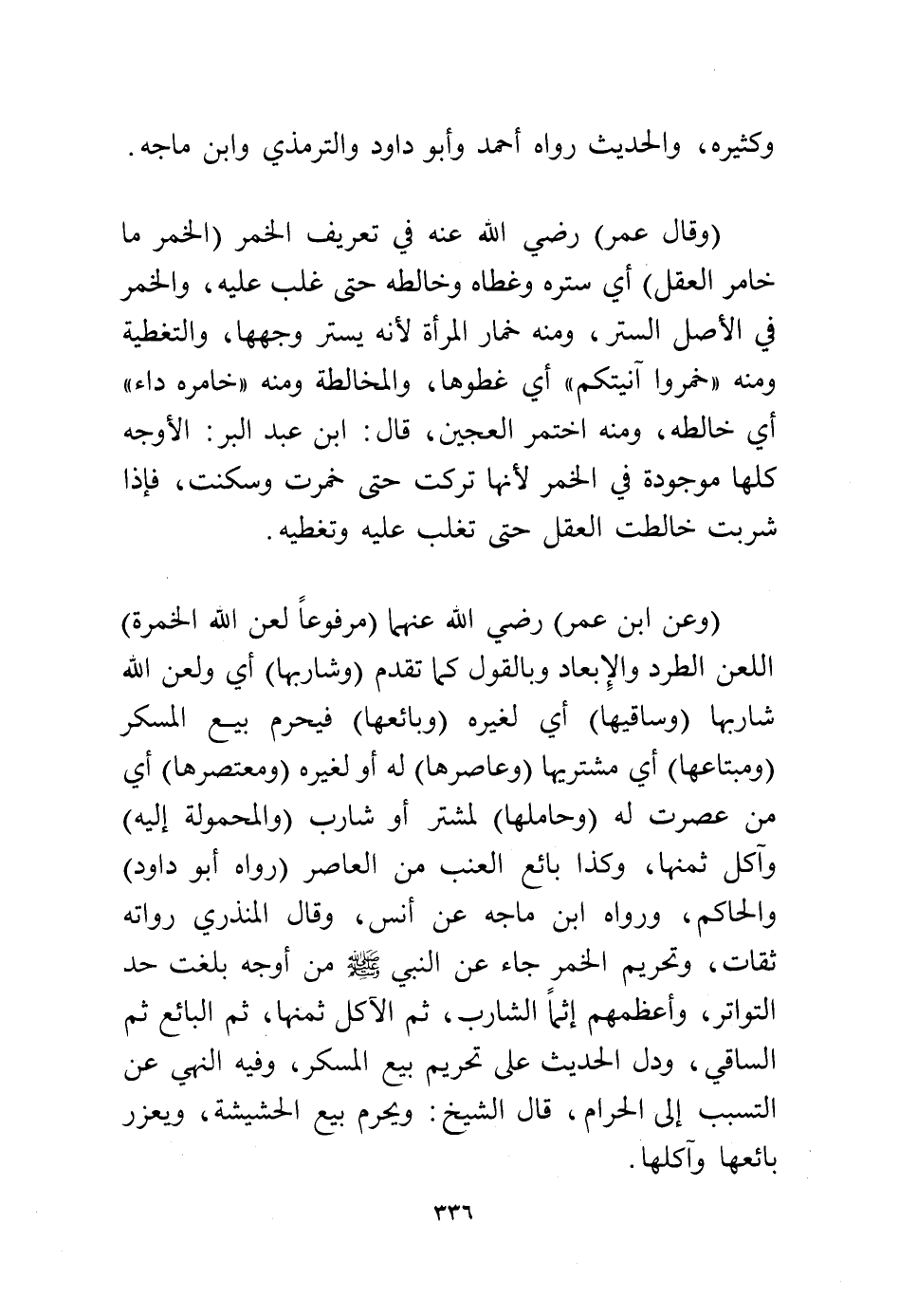 (وقال عمر) رضي الله عنه في تعريف الخمر (الخمر ما خامر العقل) أي ستره وغطاه وخالطه حتى غلب عليه، والخمر في الأصل الستر، ومنه خمار المرأة لأنه يستر وجهها والتغطية ومنه «خمروا آنيتكم» أي غطوها، والمخالطة ومنه «خامره داء» أي خالطه، ومنه اختمر العجين، قال: ابن عبد البر، الأوجه كلها موجودة في الخمر لأنها تركت حتى خمرت وسكتت فإذا شربت خالطت العقل حتى تغلب عليه