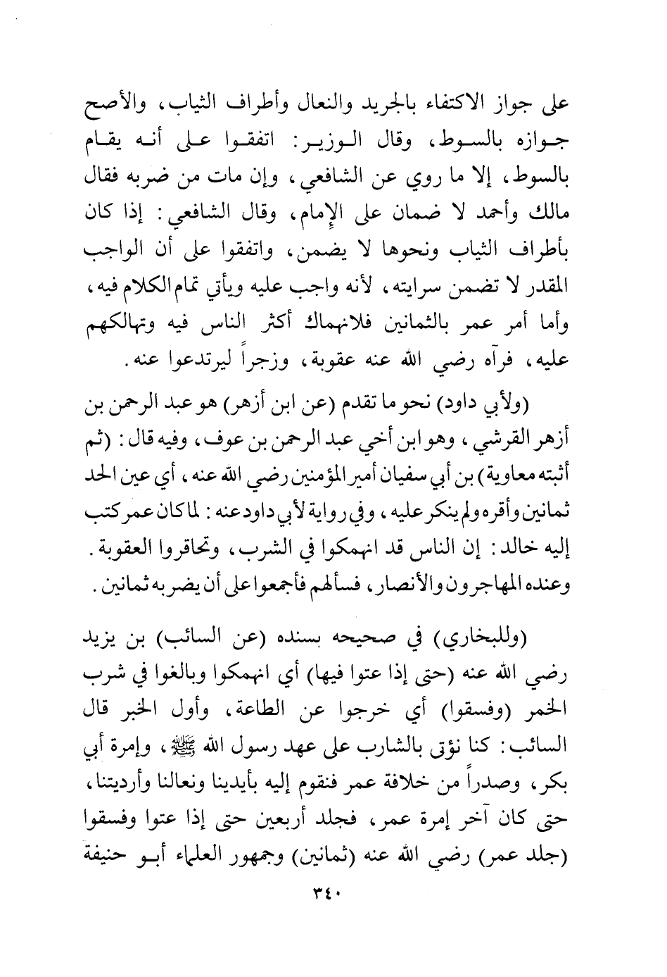 على جواز الاكتفاء بالجريد والنعال وأطراف الثياب، والأصح جوازه بالسوط، وقال الوزير: اتفقوا على أنه يقام بالسوط، إلا ما روي عن الشافعي، وإن مات من ضربه فقال مالك وأحمد لا ضمان على الإمام، وقال الشافعي، إذا كان بأطراف الثياب ونحوها لا يضمن واتفقوا على أن الواجب المقدر لا تضمن سرايته، لأنه واجب عليه ويأتي تمام الكلام فيه، وأما أمر عمر بالثمانين فلانهماك أكثر الناس فيه وتهالكهم عليه، فرآه رضي الله عنه عقوبة، وزجرًا ليرتدعوا عنه.