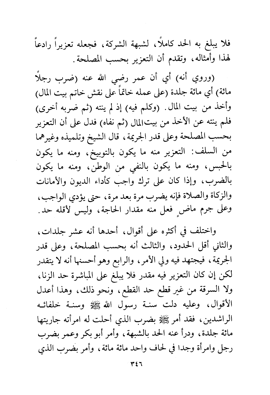 واختلف في أكثره على أقوال، أحدها أنه عشر جلدات، والثاني أقل الحدود، والثالث أنه بحسب المصلحة، وعلى قدر الجريمة، فيجتهد فيه ولي الأمر، والرابع وهو أحسنها أنه لا يتقدر لكن إن كان التعزير فيه مقدر فلا يبلغ على المباشرة حد الزنا، ولا السرقة من غير قطع حد القطع ونحو ذلك، وهذا أعدل الأقوال، وعليه دلت سنة رسول الله - صلى الله عليه وسلم - وسنة خلفائه الراشدين، فقد أمر - صلى الله عليه وسلم - بضرب الذي أحلت له امرأته جاريتها مائة جلدة، ودرأ عنه الحد بالشبهة، وأمر أبو بكر وعمر بضرب رجل وامرأة وجدا في لحاف واحد مائة مائة، وأمر بضرب الذي