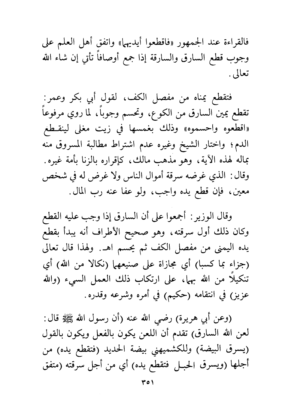 فتقطع يمناه من مفصل الكف، لقول أبي بكر وعمر: تقطع يمين السارق من الكوع، وتحسم وجوبًا لما روي مرفوعًا «اقطعوه واحسموه» وذلك بغمسها في زيت مغلي لينقطع الدم؛ واختار الشيخ وغيره عدم اشتراط مطالبة المسروق منه بماله لهذه الآية، وهو مذهب مالك، كإقراره بالزنا بأمة غيره، وقال: الذي غرضه سرقة أموال الناس ولا غرض له في شخص معين، فإن قطع يديه واجب ولو عفا عنه رب المال.