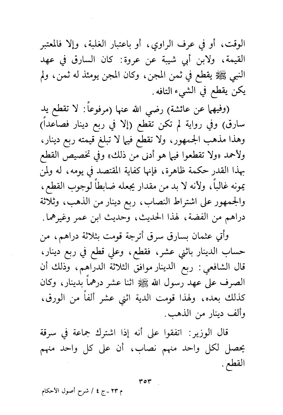 (وفيهما عن عائشة) رضي الله عنها (مرفوعًا: لا تقطع يد سارق) وفي رواية لم تكن تقطع (إلا في ربع دينار فصاعدًا) وهذا مذهب الجمهور، ولا تقطع فيما لا تبلغ قيمته ربع دينار، ولأحمد «ولا تقطعوا فيما هو أدنى من ذلك» وفي تخصيص القطع بهذا القدر حكمة ظاهرة، فإنها كفاية المقتصد في يومه، له ولمن يمونه غالبًا؛ ولأنه لابد من مقدار يجعله ضابطًا لوجوب القطع، والجمهور على اشتراط النصاب، ربع دينار من الذهب، وثلاثة دراهم من الفضة، لهذا الحديث، وحديث ابن عمر وغيرهما.