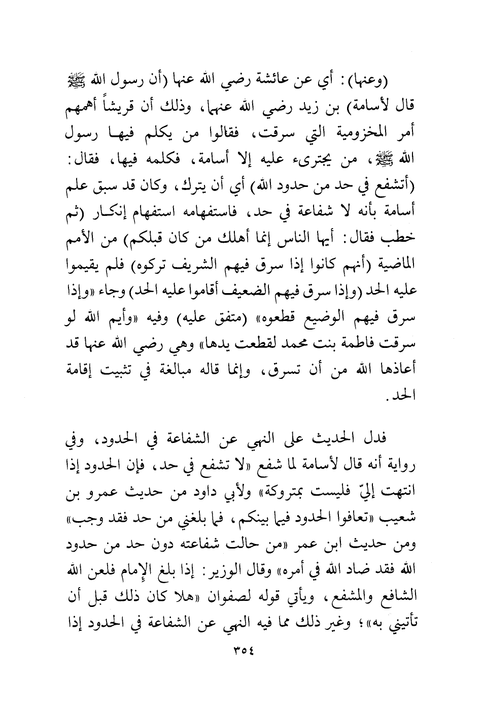 فدل الحديث على النهي عن الشفاعة في الحدود وفي رواية أنه قال لأسامة لما شفع «لا تشفع في حد، فإن الحدود إذا انتهت إلي فليست بمتروكة» ولأبي داود من حديث عمرو بن شعيب «تعافوا الحدود فيما بينكم فما بلغني من حد فقد وجب» ومن حديث ابن عمر «من حالت شفاعته دون حد من حدود الله فقد ضاد الله في أمره». وقال الوزير: إذا بلغ الإمام فلعن الله الشافع والمشفع، ويأتي قوله لصفوان «هلا كان ذلك قيل أن تأتيني به» وغير ذلك مما فيه النهي عن الشفاعة في الحدود إذا
