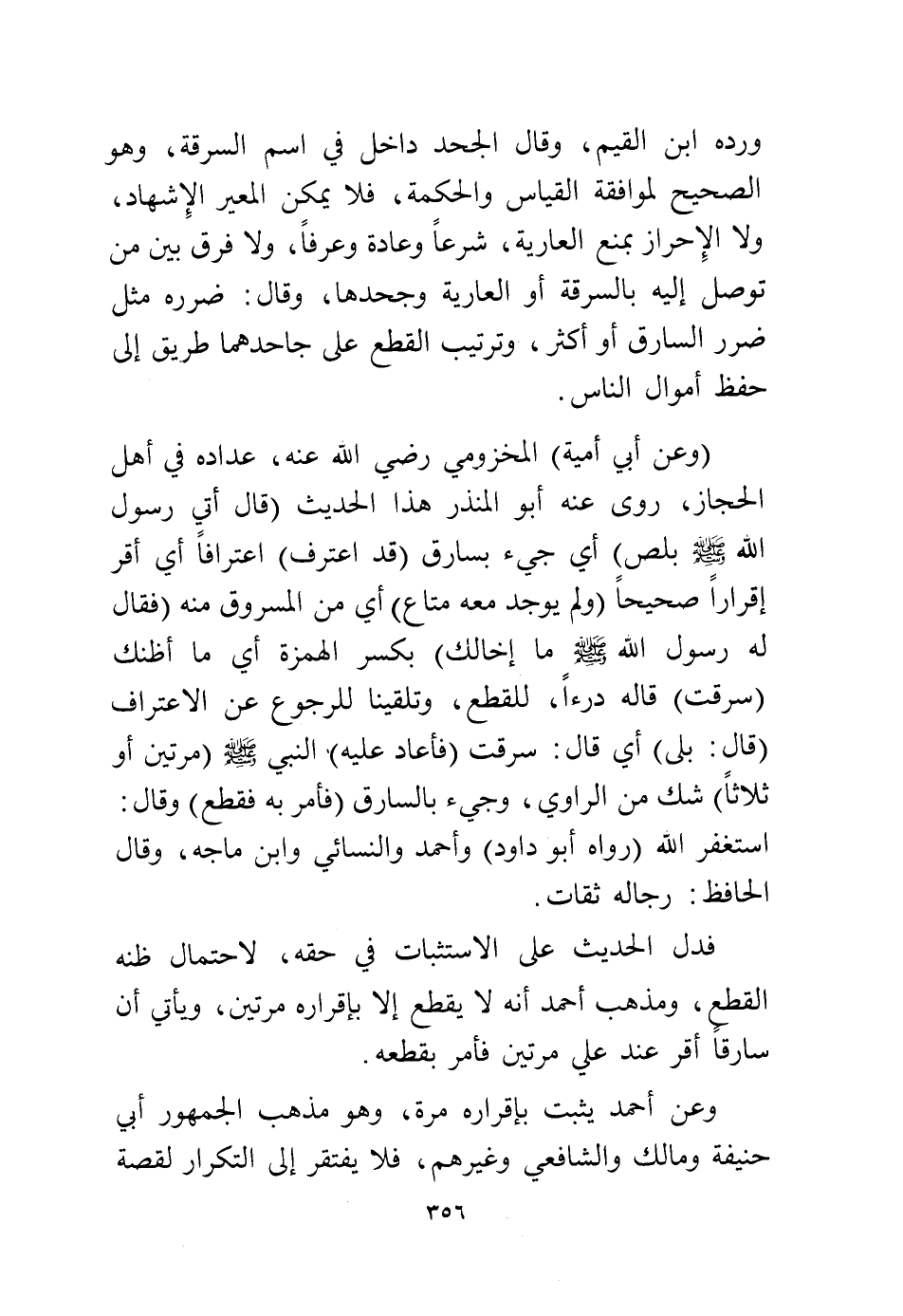 ورده ابن القيم، وقال الجحد داخل في اسم السرقة، وهو الصحيح لموافقة القياس والحكمة فلا يمكن المعير الإشهاد، ولا الإحراز بمنع العارية شرعًا وعادة وعرفًا ولا فرق بين من توصل إليه بالسرقة أو العارية وجحدها، وقال: ضرره مثل ضرر السارق أو أكثر، وترتيب القطع على جاحدها طريق إلى حفظ أموال الناس.