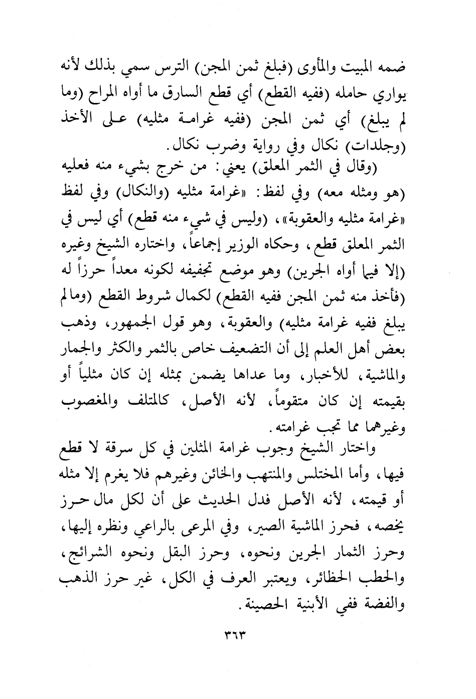 واختار الشيخ وجوب غرامة المثلين في كل سرقة لا قطع فيها، وأما المختلس والمنتهب والخائن وغيرهم فلا يغرم إلا مثله أو قيمته، لأنه الأصل فدل الحديث على أن لكل مال حرز يخصه، فحرز الماشية الصير، وفي المرعى بالراعي ونظره إليها، وحرز الثمار الجرين ونحوه، وحرز البقل ونحوه الشرائج والحطب الحظائر ويعتبر العرف في الكل، غير حرز الذهب والفضة ففي الأبنية الحصينة.
