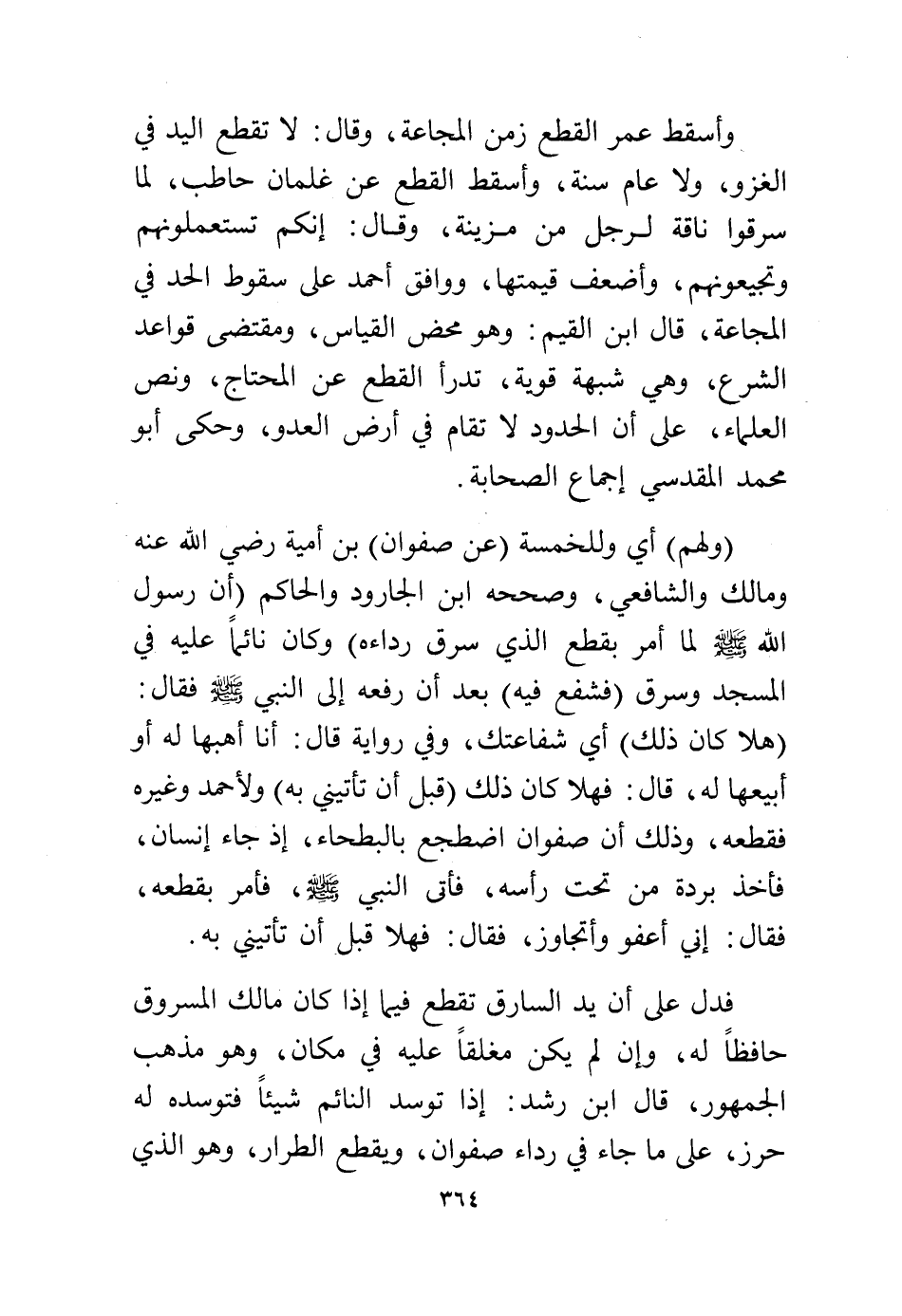 وأسقط عمر القطع زمن المجاعة وقال: لا تقطع اليد في الغزو، ولا عام سنة، وأسقط القطع عن غلمان حاطب، لما سرقوا ناقة لرجل من مزينة، وقال: إنكم تستعملونهم وتجيعونهم، وأضعف قيمتها، ووافق أحمد على سقوط الحد في المجاعة، قال ابن القيم: وهو محض القياس ومقتضى قواعد الشرع، وهي شبهة قوية، تدرأ القطع عن المحتاج ونص العلماء، على أن الحدود لا تقام في أرض العدو وحكى أبو محمد المقدسي إجماع الصحابة.