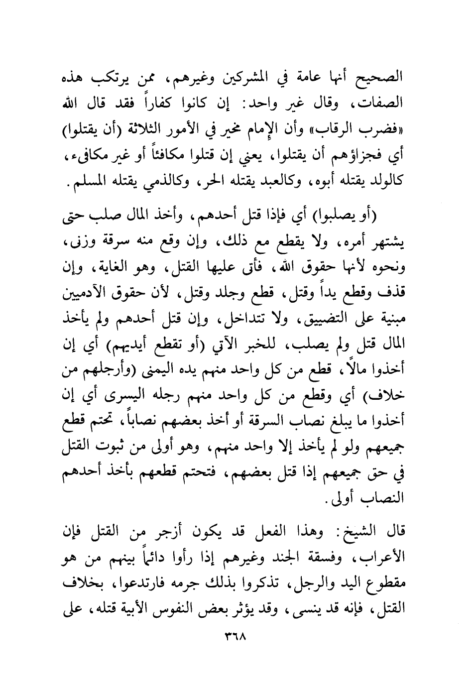 قال الشيخ: وهذا الفعل قد يكون أزجر من القتل فإن الأعراب، وفسقة الجند وغيرهم إذا رأوا دائمًا بينهم من هو مقطوع اليد والرجل، تذكروا بذلك جرمه فارتدعوا بخلاف القتل، فإنه قد ينسى، وقد يؤثر بعض النفوس الأبية قتله على