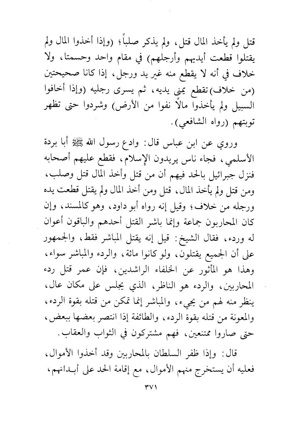 وروي عن ابن عباس قال: وادع رسول الله - صلى الله عليه وسلم - أبا بردة الأسلمي، فجاء ناس يريدون الإسلام، فقطع عليهم أصحابه فنزل جبرائيل بالحد فيهم أن من قتل وأخذ المال قتل وصلب، ومن قتل ولم يأخذ المال، قتل ومن أخذ المال ولم يقتل قطعت يده ورجله من خلاف؛ وقيل إنه رواه أبو داود، وهو كالمسند وإن كان المحاربون جماعة، وإنما باشر القتل أحدهم والباقون أعوان له وردء. فقال الشيخ: قيل إنه يقتل المباشر فقط، والجمهور على أن الجميع يقتلون، ولو كانوا مائة، والردء والمباشر سواء، وهذا هو المأثور عن الخلفاء الراشدين، فإن عمر قتل ردء المحاربين، والردء هو الناظر، الذي يجلس على مكان عال ينظر منه لهم من يجيء، والمباشر إنما تمكن من قتله بقوة الردء والمعونة من قتله بقوة الردء، والطائفة إذا انتصر بعضها ببعض، حتى صاروا ممتنعين، فهم مشتركون في الثواب والعقاب.