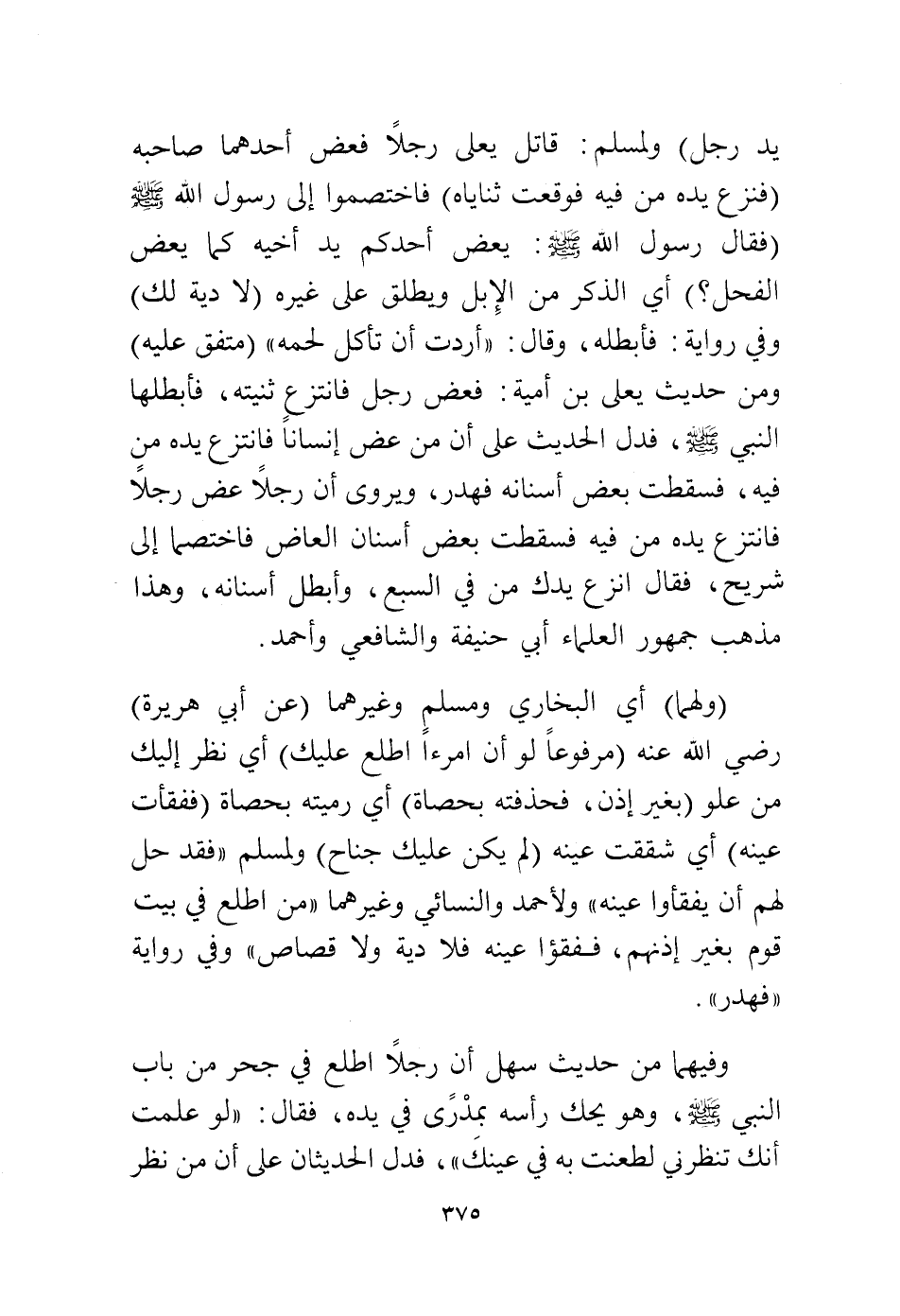 يد رجل) ولمسلم: قاتل يعلى رجلاً فعض أحدهما صاحبه (فنزع يده من فيه فوقعت ثناياه) فاختصموا إلى رسول الله - صلى الله عليه وسلم - (فقال رسول الله - صلى الله عليه وسلم -: يعض أحدكم يد أخيه كما يعض الفحل؟ أي الذكر من الإبل ويطلق على غيره (لا دية لك) وفي رواية: فأبطله وقال: "أردت أن تأكل لحمه" (متفق عليه) ومن حديث يعلى بن أمية: فعض رجل فانتزع ثنيته، فأبطلها النبي - صلى الله عليه وسلم - فدل الحديث على أن من عض إنسانًا فانتزع يده من فيه، فسقطت بعض أسنانه فهدر، ويروى أن رجلاً عض رجلاً فانتزع يده من فيه فسقطت بعض أسنان العاض فاختصما إلى شريح، فقال: أنزع يدك من في السبع، وأبطل أسنانه، وهذا مذهب جمهور العلماء أبي حنيفة والشافعي وأحمد.