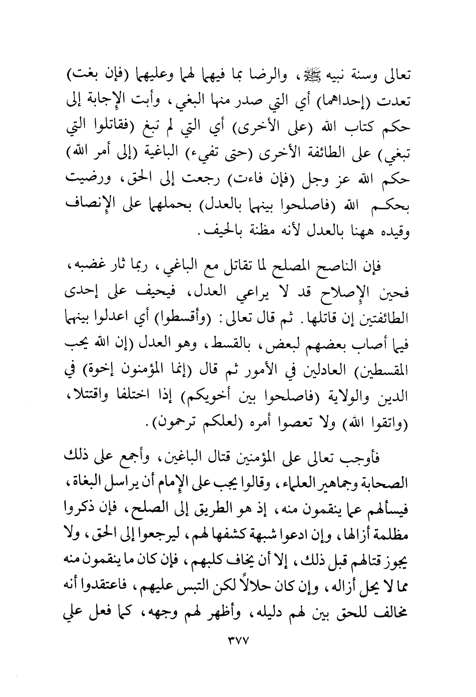 فأوجب تعالى على المؤمنين قتال الباغين، وأجمع على ذلك الصحابة وجماهير العلماء، وقالوا يجب على الإمام أن يراسل البغاة فيسألهم عما ينقمون منه، إذ هو الطريق إلى الصلح، فإن ذكروا مظلمة أزلها، وإن ادعوا شبهة كشفاها لهم، ليرجعوا إلى الحق، ولا يجوز قتالهم قبل ذلك، إلا أن يخاف كلبهم، فإن كان ما ينقمون منه مما لا يحل أزاله، وإن كان حلالاً لكن التبس عليهم، فاعتقدوا أنه مخالف للحق بين لهم دليله، وأظهر لهم وجهه، كما فعل علي