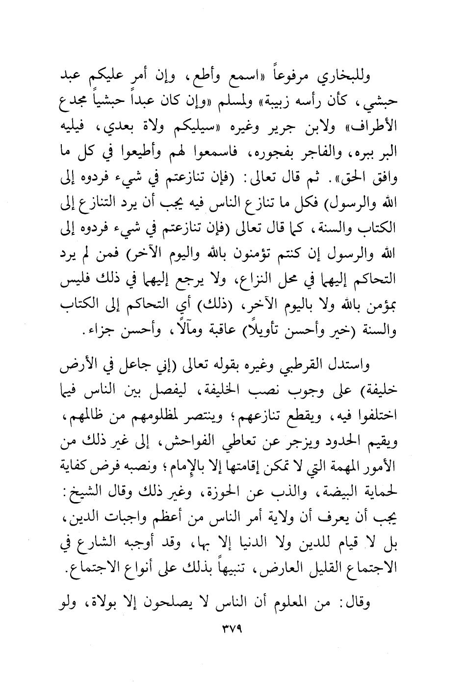 وقال: من المعلوم أن الناس لا يصلحون إلا بولاة، ولو