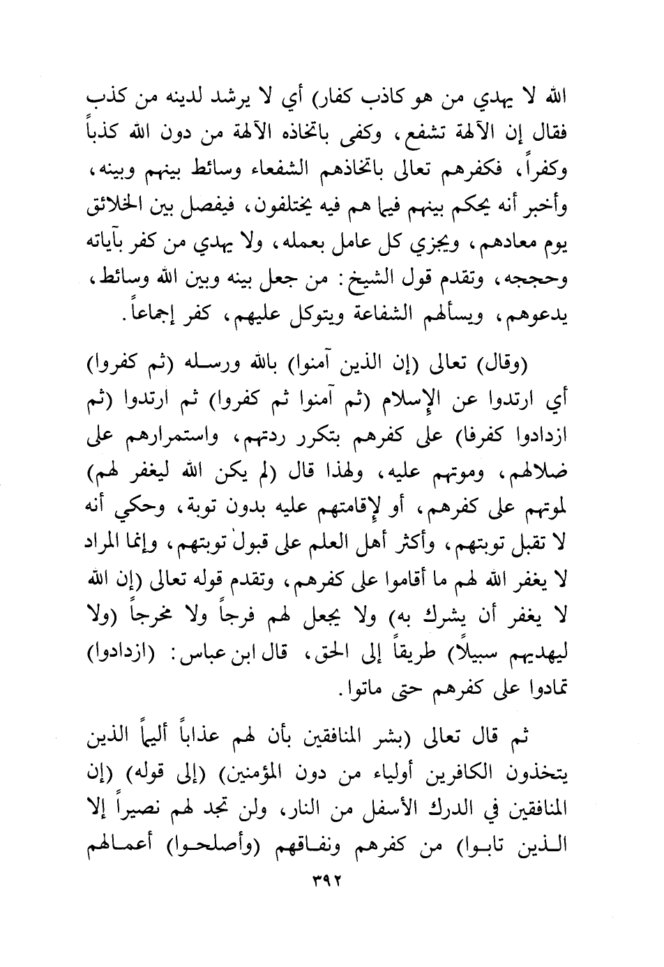 (وقال) تعالى {إِنَّ الَّذِينَ آمَنُوا} بالله ورسله {ثُمَّ كَفَرُوا} أي ارتدوا عن الإسلام {ثُمَّ آمَنُوا ثُمَّ كَفَرُوا} ثم ارتدوا {ثُمَّ ازْدَادُوا كُفْرًا} على كفرهم بتكرر ردتهم، واستمرارهم على ضلالهم، وموتهم عليه، ولهذا قال: {لَمْ يَكُنِ اللهُ لِيَغْفِرَ لَهُمْ} لموتهم على كفرهم، أو لإقامتهم عليه بدون توبة، وحكي أنه لا تقبل توبتهم، وأكثر أهل العلم على قبول توبتهم، وإنما المراد لا يغفر الله لهم ما أقاموا على كفرهم، وتقدم قوله تعالى: {إِنَّ اللهَ لَا يَغْفِرُ أَنْ يُشْرَكَ بِهِ} ولا يجعل لهم فرجًا ولا مخرجًا {وَلَا لِيَهْدِيَهُمْ سَبِيلًا} طريقاً إلى الحق، قال ابن عباس: {ازْدَادُوا} تمادوا على كفرهم حتى ماتوا.