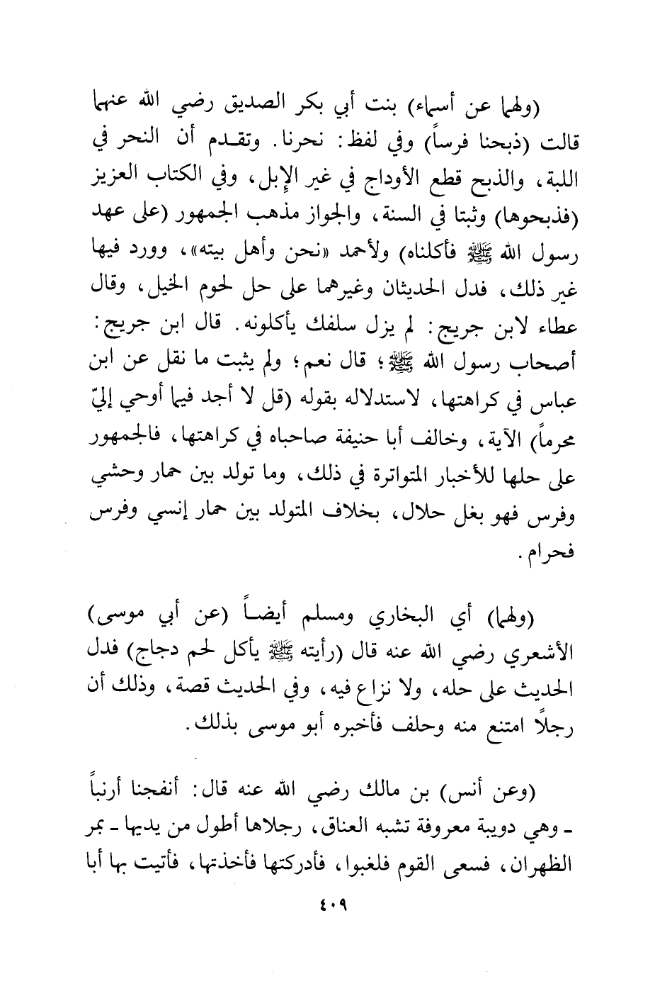 (ولهما عن أسماء) بنت أبي بكر الصديق رضي الله عنهما قالت: (ذبحنا فرسًا) وفي لفظ: نحرنا، وتقدم أن النحر في اللبة، والذبح قطع الأوداج في غير الإبل، وفي الكتاب العزيز {فَذَبَحُوهَا} وثبتا في السنة، والجواز مذهب الجمهور (على عهد رسول الله - صلى الله عليه وسلم - فأكلناه) ولأحمد "نحن وأهل بيته" وورد فيها غير ذلك، فدل الحديثان وغيرهما على حل لحوم الخيل، وقال عطاء لابن جريج: لم يزل سلفك يأكلونه، قال ابن جريج: أصحاب رسول الله - صلى الله عليه وسلم - قال: "نعم"؛ ولم يثبت ما نقل عن ابن عباس في كراهتها، لاستدلاله بقوله {قُلْ لَا أَجِدُ فِي مَا أُوحِيَ إِلَيَّ مُحَرَّمًا} الآية، وخالف أبا حنيفة صاحباه في كراهتها، فالجمهور على حلها للأخبار المتواترة في ذلك، وما تولد بين حمار وحشي وفرس فهو بغل حلال، بخلاف المتولد بين حمار إنسي وفرس فحرام.