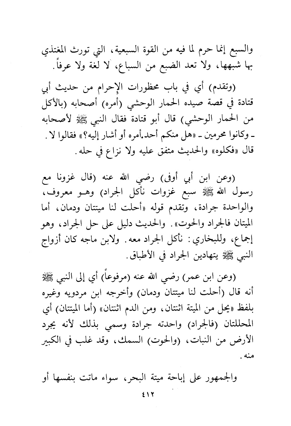 (وعن ابن أبي أوفى) رضي الله عنه (قال غزونا مع رسول الله - صلى الله عليه وسلم - سبع غزوات نأكل الجراد، وهو معروف والواحدة جرادة (متفق عليه) وتقدم قوله تعالى: {إِلَّا أَنْ يَكُونَ مَيْتَةً} واستثناء الجراد والحوت منها، والحديث دليل على حل الجراد وهو إجماع وللبخاري، نأكل الجراد معه، ولابن ماجه كان أزواج النبي - صلى الله عليه وسلم - يتهادين الجراد في الأطباق.