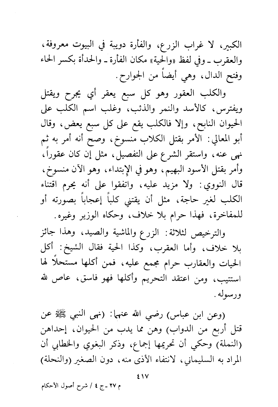(وعن ابن عباس) رضي الله عنهما (نهى النبي - صلى الله عليه وسلم - عن قتل أربع من الدواب) وهن مما يدب من الحيوان، إحداهن (النملة) وحكي أن تحريمها إجماع، وذكر البغوي والخطابي أن المراد به السليماني لانتفاء الأذى منه، دون الصغير (والنحلة)