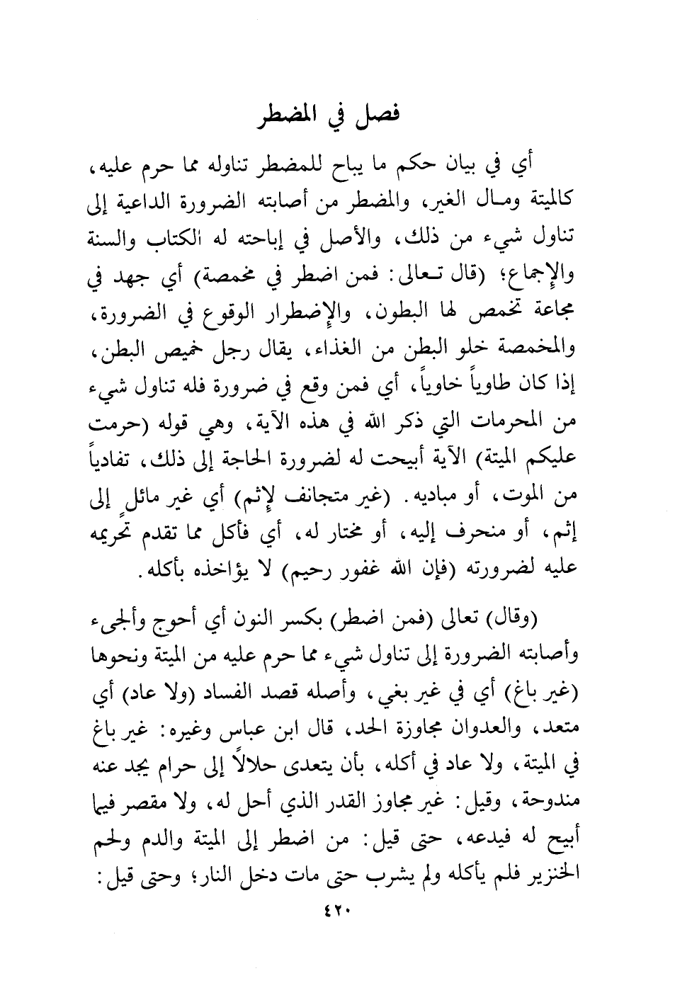 أي في بيان حكم ما يباح للمضطر تناوله مما حرم عليه، كالميتة ومال الغير، والمضطر من أصابته الضرورة الداعية إلى تناول شيء من ذلك، والأصل في إباحته له الكتاب والسنة والإجماع (قال تعالى: {فَمَنِ اضْطُرَّ فِي مَخْمَصَةٍ} أي جهد في مجاعة تخمص لها البطون، والاضطرار الوقوع في الضرورة، والمخمصة خلو البطن من الغذاء، يقال رجل خميص البطن، إذا كان طاويًا خاويًا، أي فمن وقع في ضرورة فله تناول شيء من المحرمات التي ذكر الله في هذه الآية. وهي قوله: {حُرِّمَتْ عَلَيْكُمُ الْمَيْتَةُ} الآية أبيحت له لضرورة الحاجة إلى ذلك تفاديًا من الموت، أو مبادية (غير متجانف لإثم) أي غير مائل إلى إثم، أو منحرف إليه، أو مختار له، أي فأكل مما تقدم تحريمه، عليه لضرورته {فَإِنَّ اللهَ غَفُورٌ رَحِيمٌ} لا يؤاخذه بأكله.