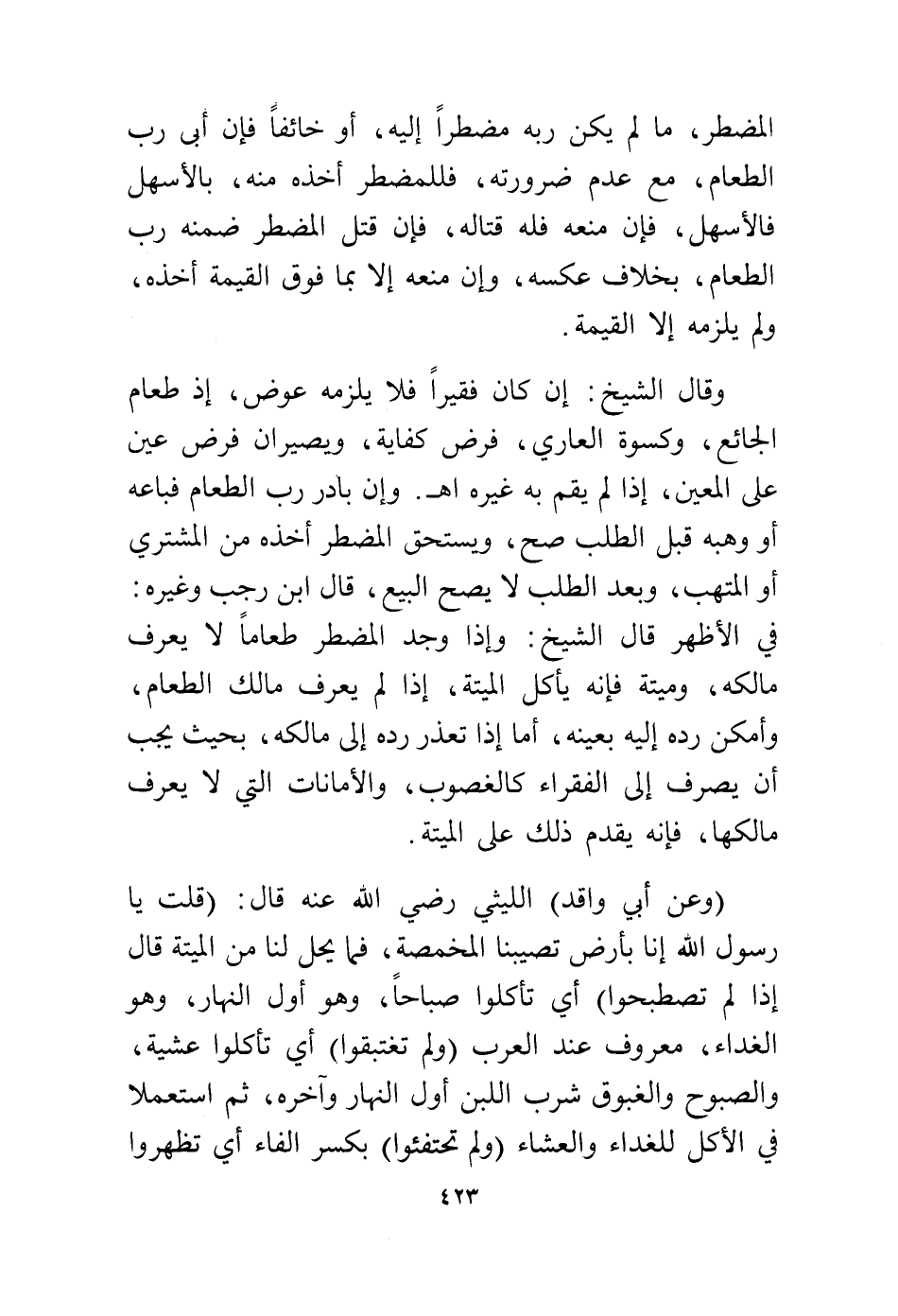 وقال الشيخ: إن كان فقيرًا فلا يلزمه عوض، إذ طعام الجائع، وكسوة العاري، فرض كفاية، ويصيران فرض عين على المعين، إذا لم يقم به غيره اهـ وإن بادر رب الطعام فباعه أو وهبه قبل الطلب صح، ويستحق المضطر أخذه من المشتري أو المتهب، وبعد الطلب لا يصح البيع، قال ابن رجب وغيره، في الأظهر قال الشيخ: وإذا وجد المضطر طعامًا لا يعرف مالكه، وميتة فإنه يأكل الميتة، إذا لم يعرف مالك الطعام، وأمكن رده إليه بعينه، وأما إذا تعذر رده إلى مالكه، بحيث يجب أن يصرف إلى الفقراء كالغصوب، والأمانات التي لا يعرف مالكها فإنه يقدم ذلك على الميتة.