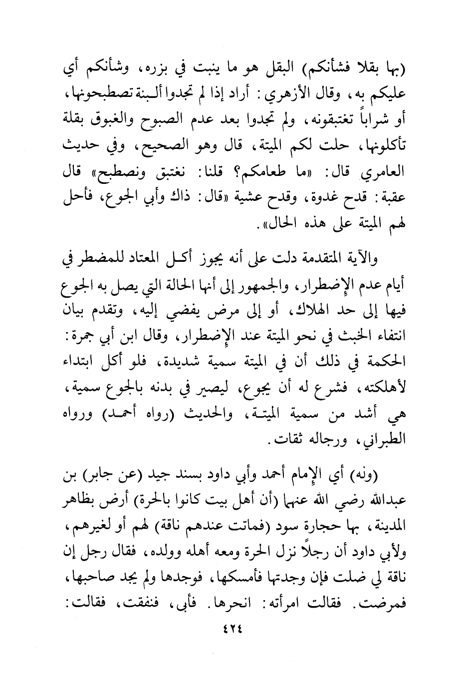 والآية المتقدمة دلت على أنه يجوز أكل المعتاد للمضطر في أيام عدم الاضطرار والجمهور إلى أنها الحالة التي يصل بها الجوع فيها إلى حد الهلاك، أو إلى مرض يفضي إليه، وتقدم بيان انتفاء الخبث في نحو الميتة عند الاضطرار، وقال ابن أبي حمزة: الحكمة في ذلك أن في الميتة سمية شديدة، فلو أكل ابتداء لأهلكته، فشرع له أن يجوع، ليصير في بدنه بالجوع سمية، هي أشد من سمية الميتة، والحديث (رواه أحمد) ورواه الطبراني ورجاله ثقات.