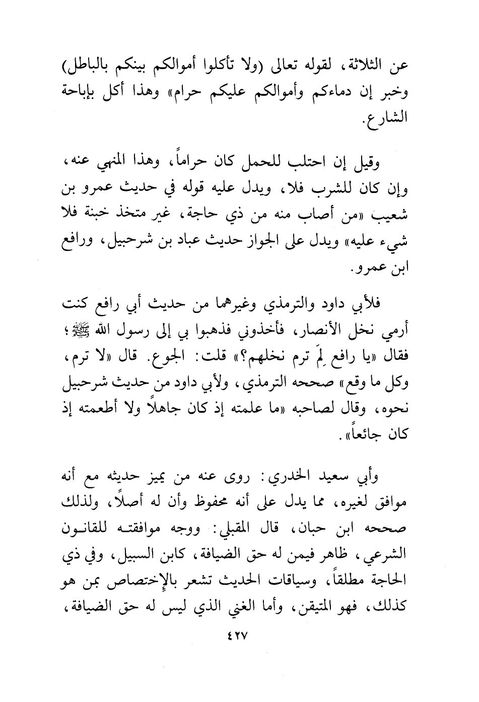 وأبي سعيد الخدري: روى عنه من يميز حديثه مع أنه موافق لغيره، مما يدل على أنه محفوظ وأن له أصلاً، ولذلك صححه ابن حبان، قال المقبلي: ووجه موافقته للقانون الشرعي، ظاهر فيمن له حق الضيافة، كابن السبيل وفي ذي الحاجة مطلقًا، وسياقات الحديث تشعر بالاختصاص بمن هو كذلك، فهو المتيقن وأما الغني الذي ليس له حق الضيافة،