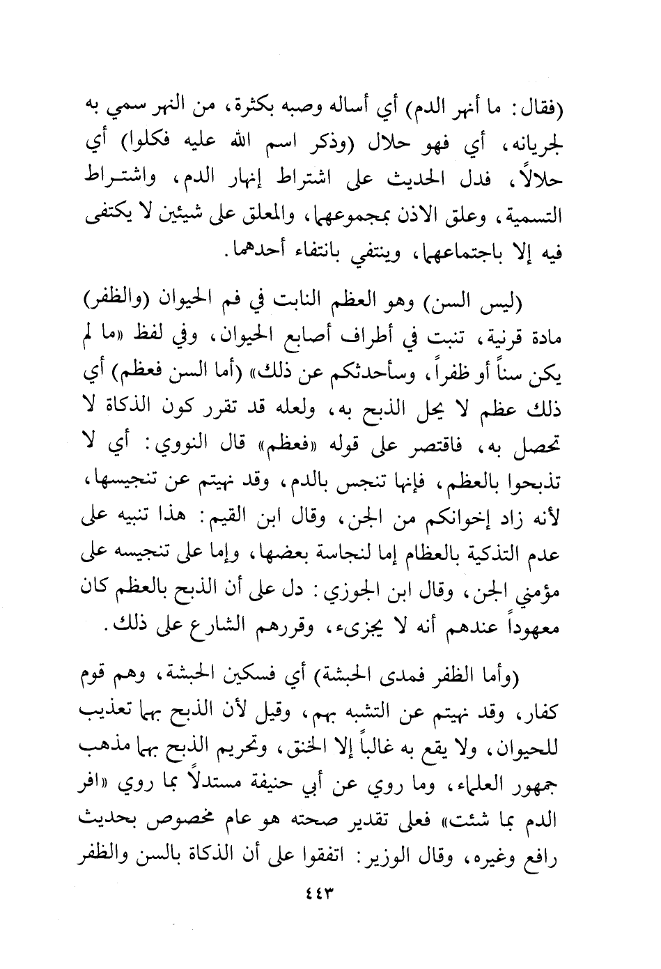 (وأما الظفر فمدى الحبشة) أي فسكين الحبشة، وهم قوم كفار، وقد نهيتهم عن التشبه بهم، وقيل لأن الذبح بهما تعذيب للحيوان، ولا يقع به غالبًا إلا الخنق، وتحريم الذبح بهما مذهب جمهور العلماء، وما روي عن أبي حنيفة مستدلاً بما روي "فر الدم بما شئت" فعلى تقدير صحته هو عوام مخصوص بحديث رافع وغيره، وقال الوزير: اتفقوا على أن الذكاة بالسن والظفر