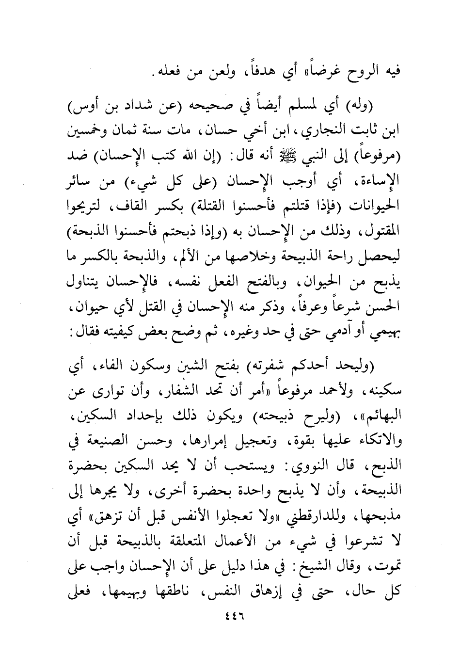 وقال الشيخ: في هذا دليل على أن الإحسان واجب على كل حال، حتى في إزهاق النفس ناطقها وبهيمها فعلى