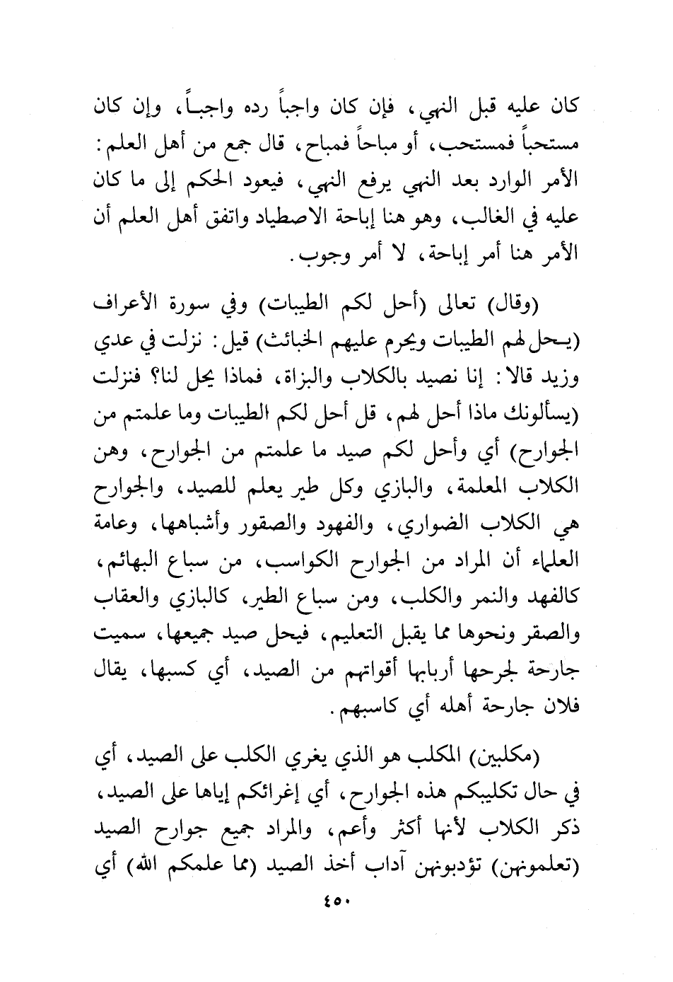 (وقال) تعالى {أُحِلَّ لَكُمُ الطَّيِّبَاتُ} وفي سورة الأعراف {يُحِلُّ لَهُمُ الطَّيِّبَاتِ وَيُحَرِّمُ عَلَيْهِمُ الْخَبَائِثَ} قيل: نزلت في عدي وزيد قالا: إنا نصيد بالكلاب والبزاة، فماذا يحل لنا؟ فنزلت {يَسْأَلُونَكَ مَاذَا أُحِلَّ لَهُمْ قُلْ أُحِلَّ لَكُمُ الطَّيِّبَاتُ وَمَا عَلَّمْتُمْ مِنَ الْجَوَارِحِ} أي وأحل لكم صيد ما علمتم من الجوارح، وهن الكلاب المعلمة، والبازي وكل طير يعلم للصيد.