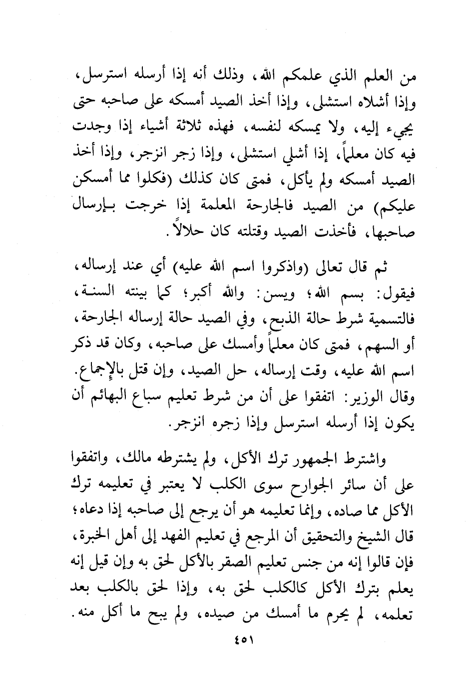 واشترط الجمهور ترك الأكل ولم يشترط مالك واتفقوا على أن سائر الجوارح سوى الكلب لا يعتبر في تعليمه ترك الأكل مما صاده، وإنما تعليمه هو أن يرجع إلى صاحبه إذا دعاه؛ قال الشيخ والتحقيق أن المرجع في تعليم الفهد إلى أهل الخبرة، فإن قالوا إنه من جنس تعليم الصقر بالأكل لحق به وإن قيل إنه يعلم بترك الأكل كالكلب لحق به، وإذا لحق بالكلب بعد تعلمه، لم يحرم ما أمسك من صيده، ولم يبح ما أكل منه