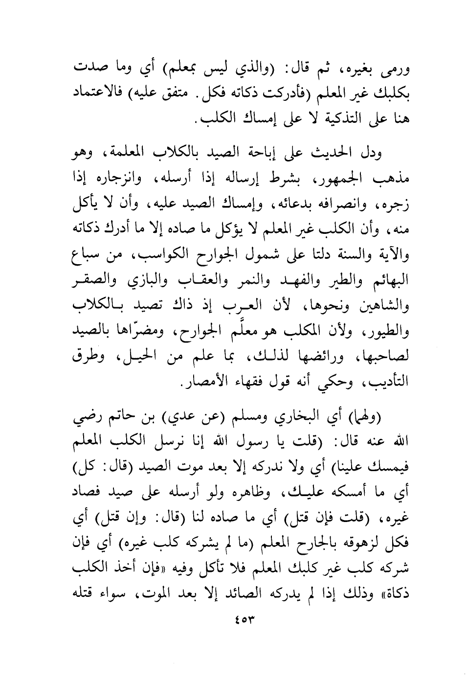ودل الحديث على إباحة الصيد بالكلاب المعلمة، وهو مذهب الجمهور، بشرط إرساله إذا أرسله، وانزجاره إذا زجره، وانصرافه بدعائه، وإمساك الصيد عليه، وأن لا يأكل منه، وأن الكلب غير المعلم لا يؤكل ما صاده إلا ما أدرك ذكاته والآية والسنة دلتا على شمول الجوارح الكواسب، ومن سباع البهائم والطير والفهد والنمر والعقاب والبازي والصقر والشاهين ونحوها، لأن العرب إذا ذاك تصيد بالكلاب والطيور، ولأن المكلب هو معلم الجوارح، ومضراها بالصيد لصاحبها، وارائضها لذلك، بما علم من الحيل، وطرق التأديب وحكي أنه قول فقهاء الأمصار.