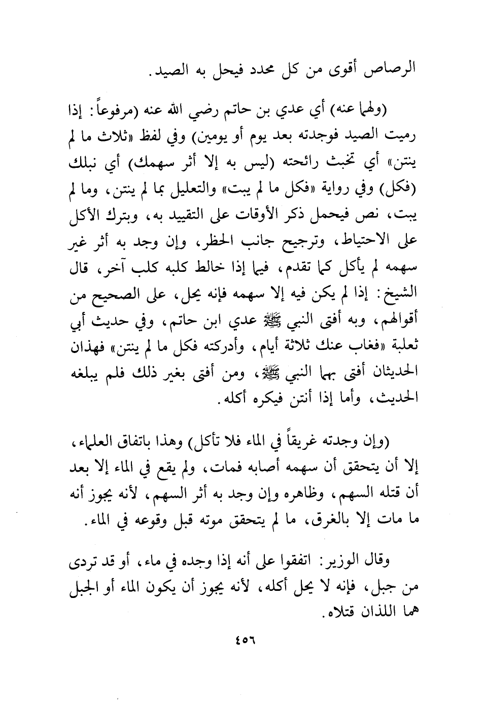 (وإن وجدته غريقًا في الماء فلا تأكل) وهذا باتفاق العلماء إلا أن يتحقق أن سهمه أصابه فمات، ولم يقع في الماء إلا بعد أن قتله السهم، وظاهره، وإن وجد به أثر السهم، لأنه يجوز أنه ما مات إلا بالغرق، ما لم يتحقق موته قبل وقوعه في الماء.