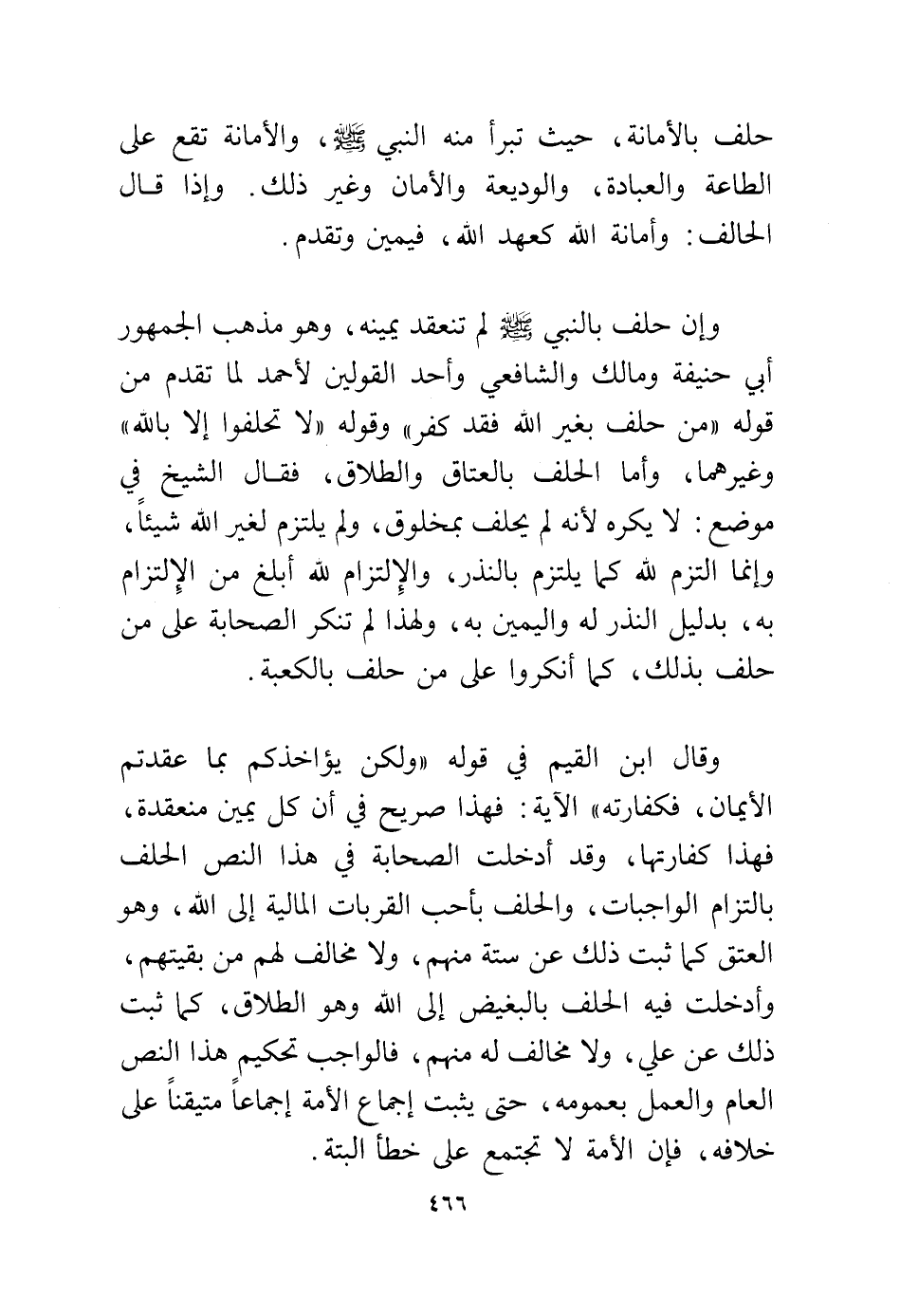 وقال ابن القيم في قوله: {وَلَكِنْ يُؤَاخِذُكُمْ بِمَا عَقَّدْتُمُ الْأَيْمَانَ فَكَفَّارَتُهُ} الآية: فهذا صريح في أن كل يمين منعقدة، فهذا كفارتها، وقد أدخلت الصحابة في هذا النص الحلف بالتزام الواجبات، والحلف بأحب القربات المالية إلى الله، وهو العتق كما ثبت ذلك عن ستة منهم، ولا مخالف لهم من بقيتهم، وأدخلت فيه الحلف بالبغيض إلى الله وهو الطلاق، كما ثبت ذلك عن علي، ولا مخالف له منهم، فالواجب تحكيم هذا النص العام والعمل بعمومه، حتى يثبت إجماع الأمة إجماعًا متيقنًا على خلافه، فإن الأمة لا تجتمع على خطأ ألبتة.
