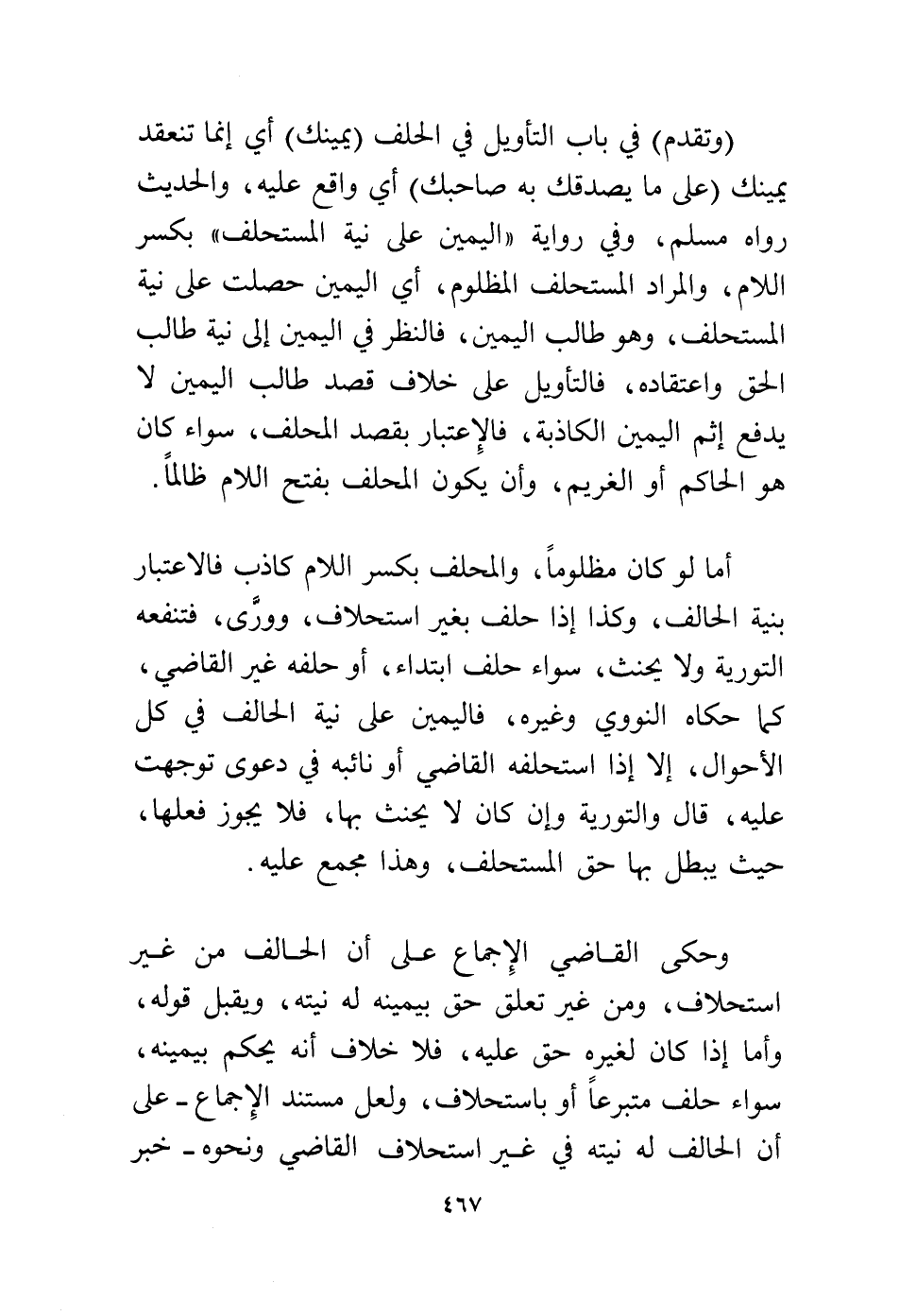 أما لو كان مظلومًا، والمحلف بكسر اللام كاذب فالاعتبار بنية الحالف، وكذا إذا حلف بغير استحلاف، وورّى فتنفعه التورية ولا يحنث سواء حلف ابتداء، أو حلفه غير القاضي، كما حكاه النووي وغيره، فاليمين على نية الحالف في كل الأحوال إلا إذا استحلفه القاضي أو نائبه في دعوى توجهت عليه، قال والتورية وإن كان لا يحنث بها، فلا يجوز فعلها، حيث يبطل بها حق المستحلف وهذا مجمع عليه.