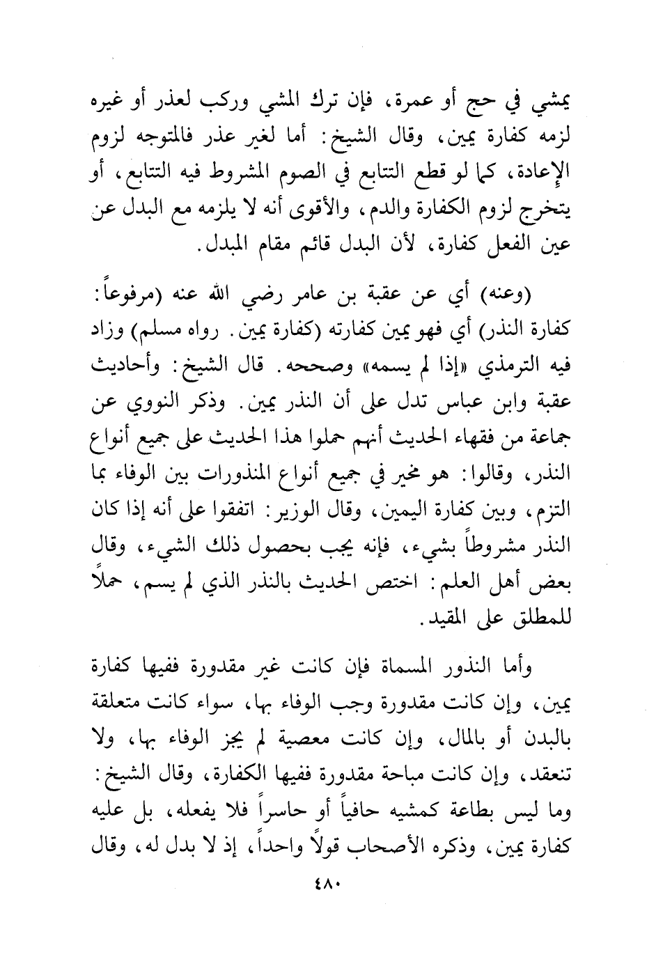 (وعنه) أي عن عقبة بن عامر رضي الله عنه (مرفوعًا: كفارة النذر) أي فهو يمين كفارته (كفارة يمين. رواه مسلم) وزاد فيه الترمذي "إذا لم يسمه" وصححه. قال الشيخ: وأحاديث عقبة وابن عباس تدل على أن النذر يمين، وذكر النووي عن جماعة من فقهاء الحديث أنهم حملوا هذا الحديث على جميع أنواع النذر، وقالوا: هو مخير في جميع أنواع المنذورات بين الوفاء بما التزم، وبين كفارة اليمين، وقال الوزير: اتفقوا على أنه إذا كان النذر مشروطًا بشيء، فإنه يجب بحصول ذلك الشيء، وقال بعض أهل العلم، اختص الحديث بالنذر الذي لم يسم حملاً للمطلق على المقيد.