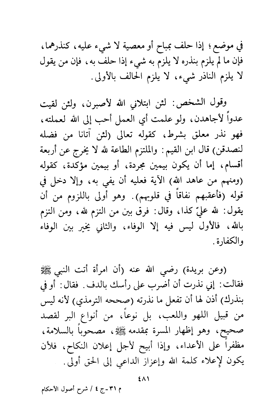 وقول الشخص، لئن ابتلاني الله لأصبرن، ولئن لقيت عدوًا لأجاهدن، ولو علمت أي العمل أحب إلى الله لعملته فهو نذر معلق بشرط، كقوله تعالى: {لَئِنْ آتَانَا مِنْ فَضْلِهِ لَنَصَّدَّقَنَّ} قال ابن القيم: والملتزم الطاعة لله لا يخرج عن أربعة أقسام، إما أن يكون بيمين مجردة أو بيمين مؤكدة كقوله (ومنهم من عاهد الله) الآية فعليه أن يفي به، وإلا دخل في قوله {فَأَعْقَبَهُمْ نِفَاقًا فِي قُلُوبِهِمْ} وهو أولى باللزوم من أن يقول: لله علي كذا، وقال: فرق بين من التزم الله، ومن التزم بالله، فالأول ليس فيه إلا الوفاء، والثاني يخير بين الوفاء والكفارة.