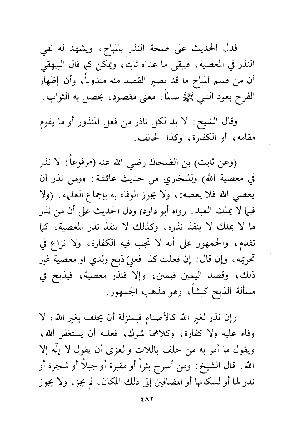 وإن نذر لغير الله كالأصنام فبمنزلة أن يحلف بغير الله، لا وفاء عليه، ولا كفارة، وكلاهما شرك، فعليه أن يستغفر الله، ويقول ما أمر به من حلف باللات والعزى أن يقول لا إله إلا الله، قال الشيخ: ومن أسرج بئرًا أو مقبرة أو جبلاً أو شجرة أو نذر لها أو لسكانها أو المضافين إلى ذلك المكان، لم يجز ولا يجوز