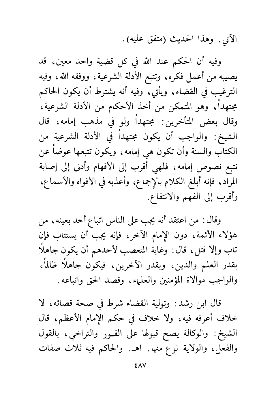 وفيه أن الحكم عند الله في كل قضية واحد معين، قد يصيبه من أعمل فكره، وتتبع الأدلة الشرعية، ووفقه الله، وفيه الترغيب في القضاء، ويأتي، وفيه أنه يشترط أن يكون الحاكم مجتهدًا وهو المتمكن من أخذ الأحكام من الأدلة الشرعية، وقال بعض المتأخرين: مجتهدًا ولو في مذهب إمامه، وقال الشيخ: والواجب أن يكون مجتهدًا في الأدلة الشرعية من الكتاب، والسنة وأن تكون هي إمامه، ويكون تتبعها عوضًا عن تتبع نصوص إمامه، فلهي أقرب إلى الأفهام وأدنى إلى إصابة المراد، فإنه أبلغ الكلام بالإجماع، وأعذبه في الأفواه والأسماع، وأقرب إلى الفهم والانتفاع.