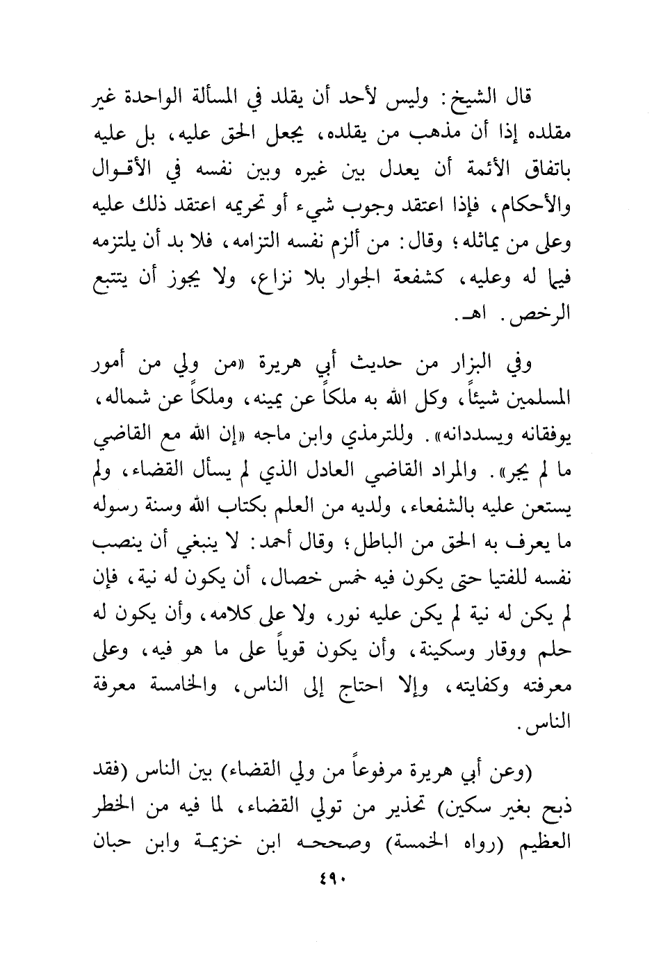 قال الشيخ: وليس لأحد أن يقلد في المسألة الواحدة غير مقلده إذا أن مذهب من يقلده، يجعل الحق عليه، بل عليه باتفاق الأئمة أن يعدل بين غيره وبين نفسه في الأقوال والأحكام، فإذا اعتقد وجوب شيء أو تحريمه اعتقد ذلك عليه وعلى من يماثله، وقال: من ألزم نفسه التزامه، فلا بد أن يلتزمه فيما له وعليه، كشفعة الجوار بلا نزاع، ولا يجوز أن يتتبع الرخص اهـ.