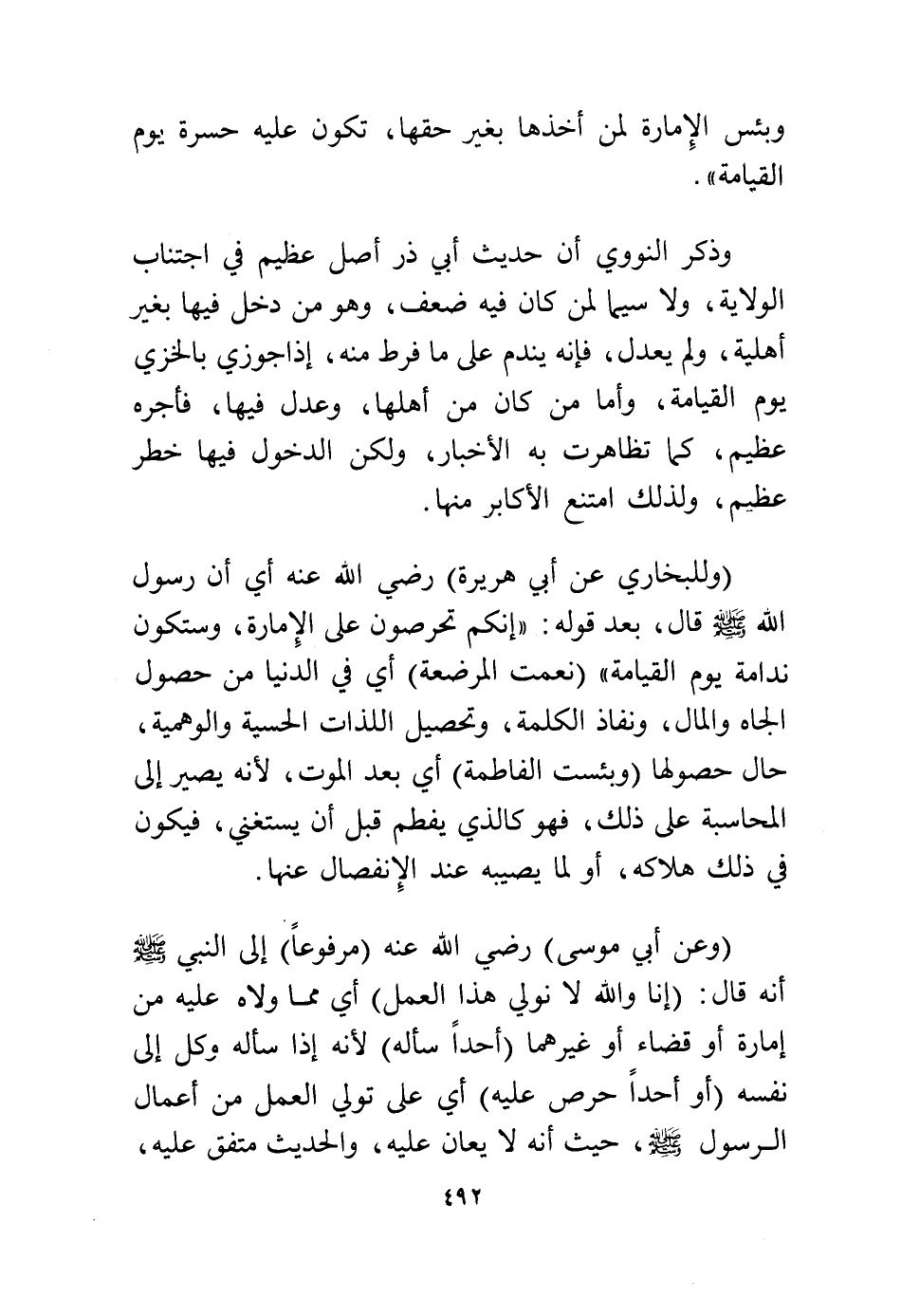 وذكر النووي أن حديث أبي ذر أصل عظيم في اجتناب الولاية، ولا سيما لمن كان فيه ضعف، وهو من دخل فيها بغير أهلية، ولم يعدل، فإنه يندم على ما فرط منه، إذا جوزي بالخزي يوم القيامة، وأما من كان من أهلها، وعدل فيها فأجره عظيم، كما تظاهرت به الأخبار، ولكن الدخول فيها خطر عظيم، ولذلك امتنع الأكابر منها.