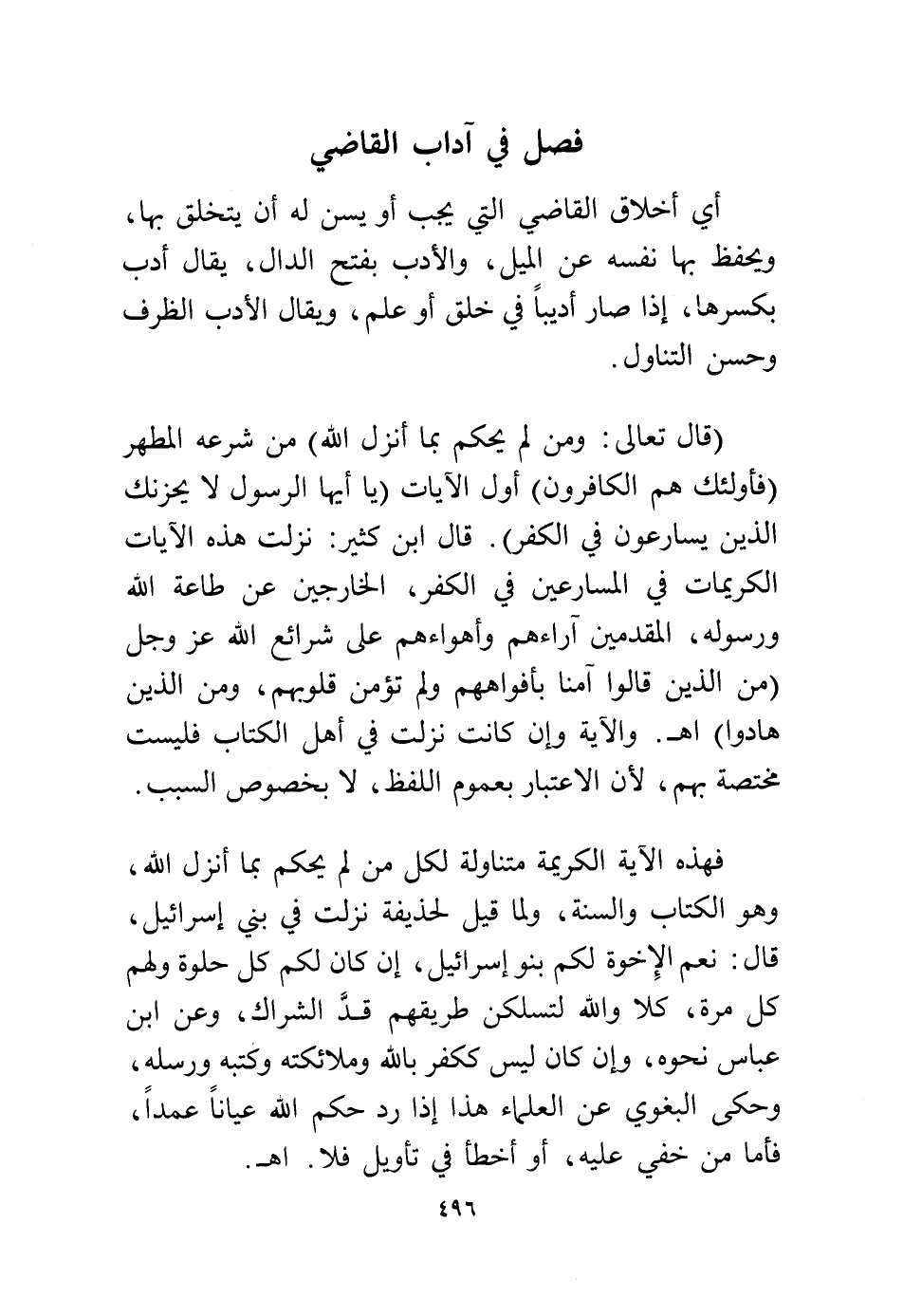 (قال تعالى: {وَمَنْ لَمْ يَحْكُمْ بِمَا أَنْزَلَ اللهُ}) من شرعه المطهر {فَأُولَئِكَ هُمُ الْكَافِرُونَ} أول الآيات {يَا أَيُّهَا الرَّسُولُ لَا يَحْزُنْكَ الَّذِينَ يُسَارِعُونَ فِي الْكُفْرِ} قال ابن كثير: نزلت هذه الآيات الكريمات في المسارعين في الكفر، الخارجين عن طاعة الله، ورسوله، المقدمين آراءهم وأهواءهم على شرائع الله عز وجل {مِنَ الَّذِينَ قَالُوا آمَنَّا بِأَفْوَاهِهِمْ وَلَمْ تُؤْمِنْ قُلُوبُهُمْ وَمِنَ الَّذِينَ هَادُوا} اهـ والآية وإن كانت نزلت في أهل الكتاب فليست مختصة بهم، لأن الاعتبار بعموم اللفظ، لا بخصوص السبب.