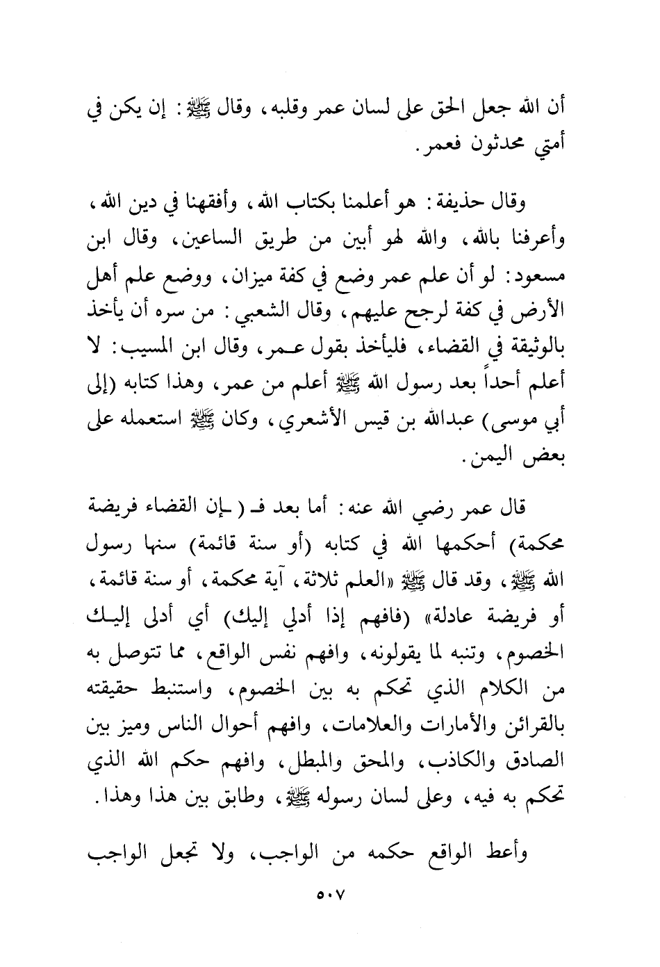 وقال حذيفة: هو أعلمنا بكتاب الله، وأفقهنا في دين الله، وأعرفنا بالله، والله لهو أبين من طريق الساعين، وقال ابن مسعود: لو أن علم عمر وضع في كفة ميزان، ووضع علم أهل الأرض في كفة لرجح عليهم، وقال الشعبي: من سره أن يأخذ بالوثيقة في القضاء، فليأخذ بقول عمر، وقال ابن المسيب: لا أعلم أحدًا بعد رسول الله - صلى الله عليه وسلم - أعلم من عمر، وهذا كتابه (إلى أبي موسى) عبد الله بن قيس الأشعري، وكان - صلى الله عليه وسلم - استعمله على بعض اليمن.