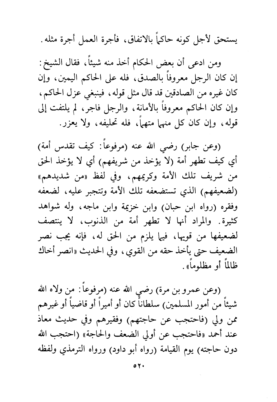 (وعن جابر) رضي الله عنه (مرفوعًا: كيف تقدس أمة) أي كيف تطهر أمة (لا يؤخذ من شريفهم) أي لا يؤخذ الحق من شريف تلك الأمة وكريمهم وفي لفظ: " من شديدهم" (لضعيفهم) الذي تستضعفه تلك الأمة وتتجبر عليه لضعفه وفقره (رواه ابن حبان) وابن خزيمة وابن ماجه، وله شواهد كثيرة، والمراد أنها لا تطهر أمة من الذنوب، لا ينتصف لضعيفها من قويها فيما يلزم من الحق له، فإنه يجب نصر الضعيف حتى يأخذ حقه من القوي، وفي الحديث: "انصر أخاك ظالمًا أو مظلومًا".