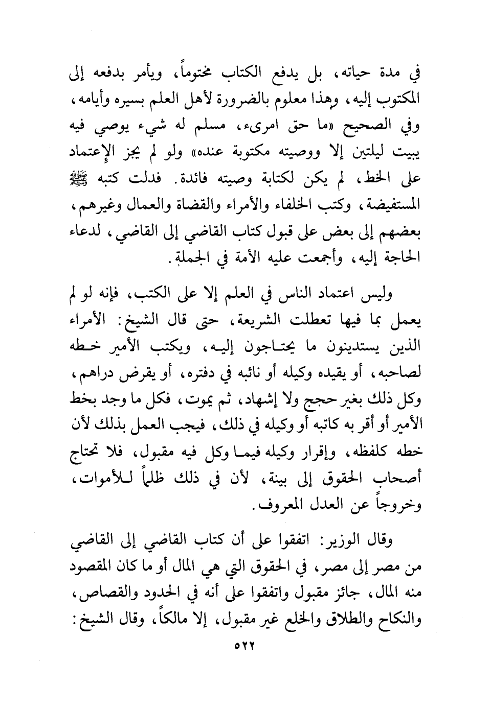 وليس اعتماد الناس في العلم إلا على الكتب، فإنه لو لم يعمل بما فيها تعطلت الشريعة حتى قال الشيخ: الأمراء الذين يستدينون ما يحتاجون إليه، ويكتب الأمير خطه لصاحبه، أو يقيده وكيله أو نائبه في دفتره، أو يقرض دراهم وكل ذلك بغير حجج ولا إشهاد، ثم يموت فكل ما وجد بخط الأمير أو أقر به كاتبه أو وكيله في ذلك، فيجب العمل بذلك لأن خطه كلفظه، وإقرار وكيله فيما وكل فيه مقبول، فلا تحتاج أصحاب لحقوق إلى بينة، لأن في ذلك ظلمًا للأموات، وخروجًا عن العدل المعروف.