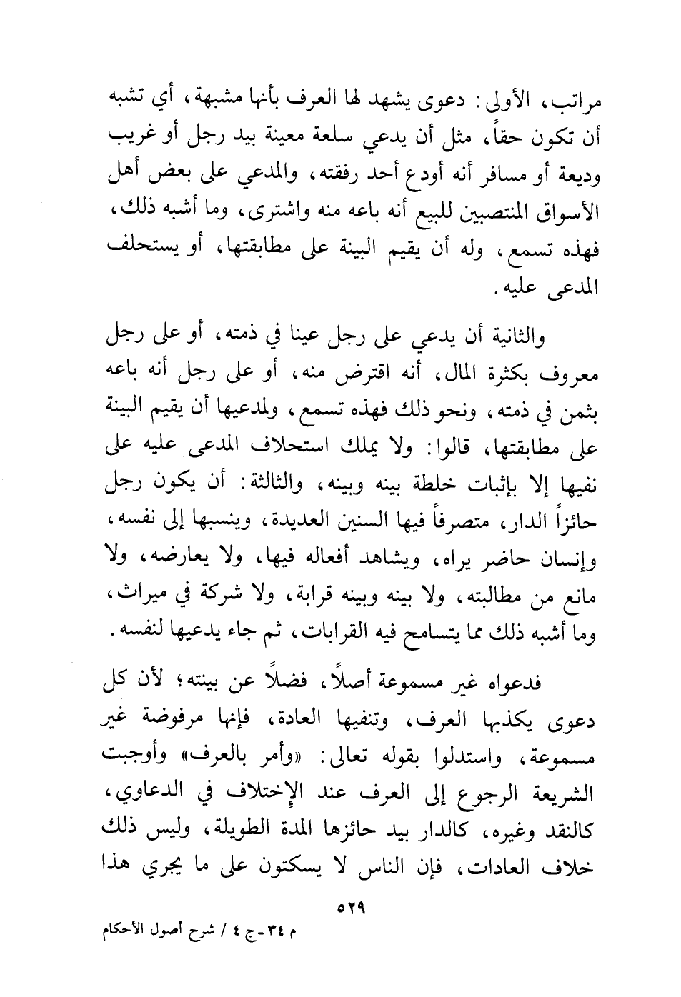 مراتب الأولى: دعوى يشهد لها العرف بأنها مشبهة، أي تشبه أن تكون حقًا، مثل أن يدعي سلعة معينة بيد رجل أو غريب وديعة أو مسافر أنه أودع أحد رفقته، والمدعي على بعض أهل الأسواق المنتصبين للبيع أنه باعه منه واشترى، وما أشبه ذلك، فهذه تسمع، وله أن يقيم البينة على مطابقتها، أو يستحلف المدعى عليه.