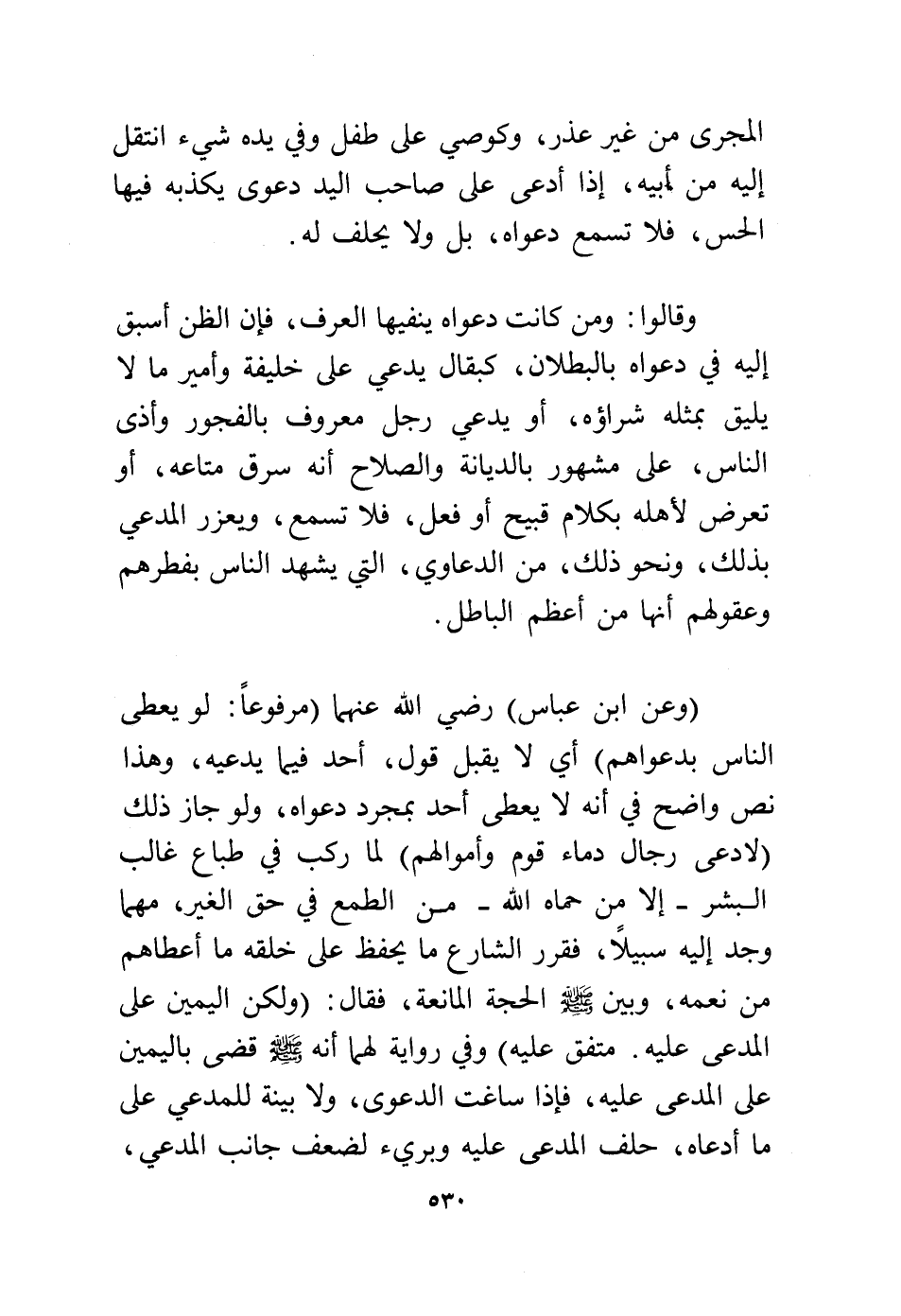 (وعن ابن عباس) رضي الله عنهما (مرفوعًا: لو يعطى الناس بدعواهم) أي لا يقبل قول، أحد فيما يدعيه، وهذا نص واضح في أنه لا يعطى أحد بمجرد دعواه، ولو جاز ذلك (لادعى رجال دماء قوم وأموالهم) لما ركب في طباع غالب البشر إلا من حماه الله- من الطمع في حق الغير، مهما وجد إليه سبيلاً فقرر الشارع ما يحفظ على خلقه ما أعطاهم من نعمة، وبين - صلى الله عليه وسلم - الحجة المانعة فقال: (ولكن اليمين على المدعي عليه، متفق عليه) وفي رواية لهما أنه - صلى الله عليه وسلم - قضى باليمين على المدعى عليه، فإذا ساغت الدعوى، ولا بينة للمدعي على ما ادعاه، حلف المدعي عليه وبرئ لضعف جانب المدعي،