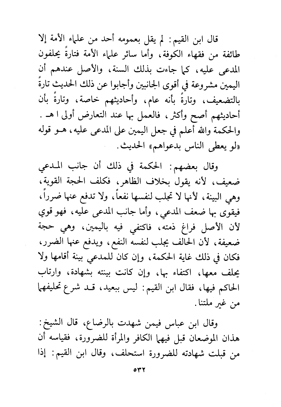 قال ابن القيم: لم يقل بعمومه أحد من علماء الأمة إلا طائفة من فقهاء الكوفة، وأما سائر علماء الأمة فتارة يحلفون المدعى عليه، كما جاءت بذلك السنة، والأصل عندهم أن اليمين مشروعة في أقوى الجانبين وأجابوا عن ذلك الحديث تارة بالتضعيف، وتارة بأنه عام، وأحاديثهم خاصة، وتارة بأن أحاديثهم أصح وأكثر، فالعمل بها عند التعارض أولى اهـ.