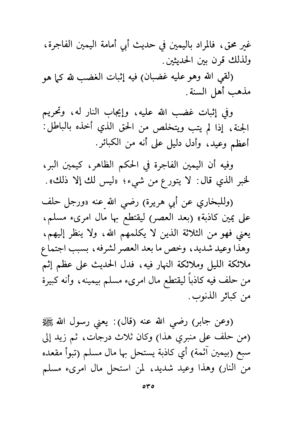 (وللبخاري عن أبي هريرة) رضي الله عنه "ورجل حلف على يمين كاذبة" (بعد العصر) ليقتطع بها مال امرئ مسلم يعني فهو من الثلاثة الذين لا يكلمهم الله، ولا ينظر إليهم، وهذا وعيد شديد، وخص ما بعد العصر لشرفه، بسبب اجتماع ملائكة الليل وملائكة النهار فيه، فدل الحديث على عظم إثم من حلف فيه كاذبًا ليقطتع مال امرئ مسلم بيمينه، وأنه كبيرة من كبائر الذنوب.