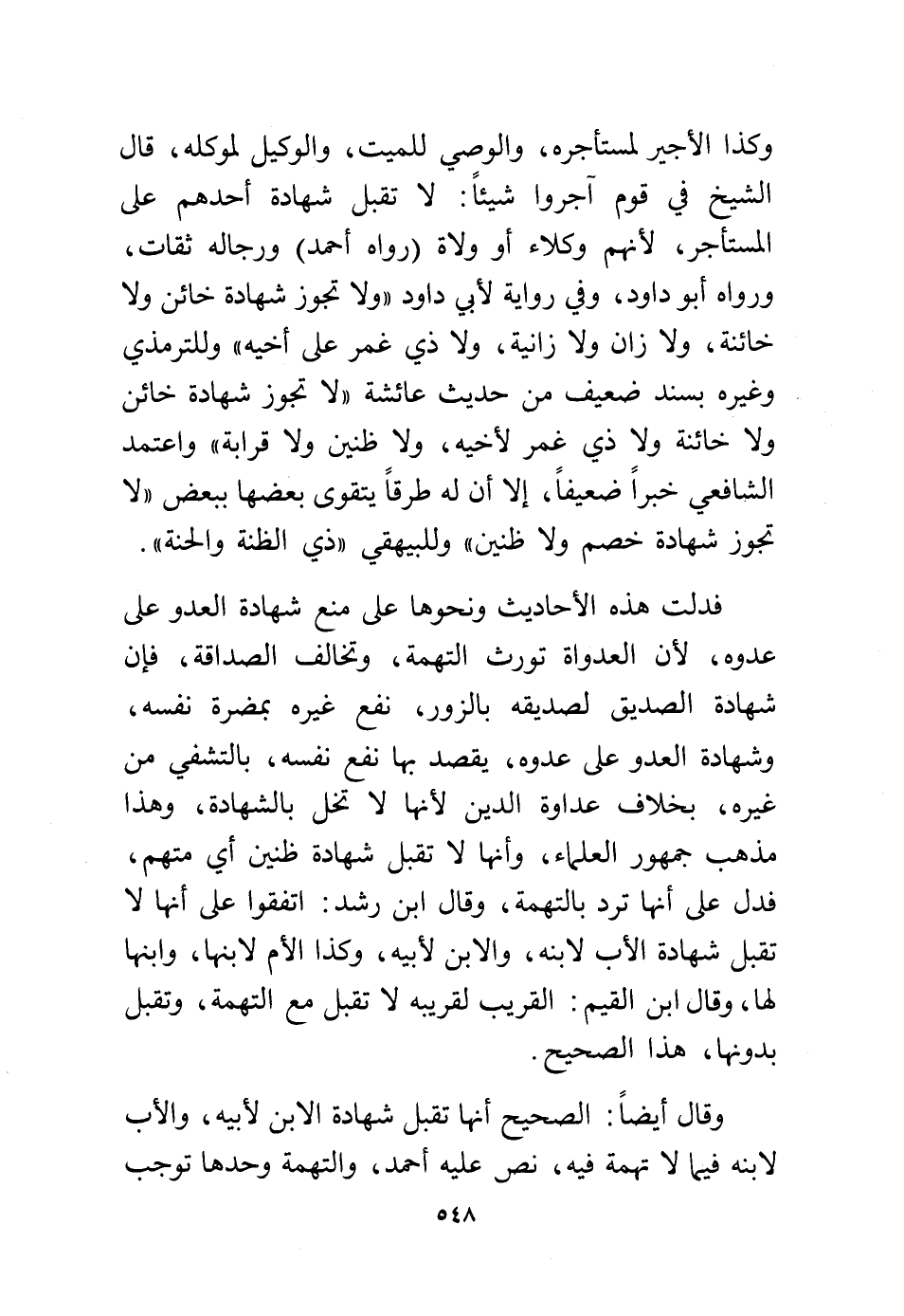 فدلت هذه الأحاديث ونحوها على منع شهادة العدو على عدوه، لأن العداوة تورث التهمة، وتخالف الصداقة، فإن شهادة الصديق لصديقه بالزور، نفع غيره بمضرة نفسه، بالتشفي من غيره، بخلاف عداوة الدين لأنها لا تخل بالشهادة، وهذا مذهب جمهور العلماء، وأنها لا تقبل شهادة ظنين أي متهم، فدل على أنها ترد بالتهمة، وقال ابن رشد: اتفقوا على أنها لا تقبل شهادة الأب لابنه، والابن لأبيه، وكذا الأم لابنها، وابنها لها، وقال ابن القيم: القريب لقريبه لا تقبل مع التهمة، وتقبل بدونها، هذا الصحيح.
