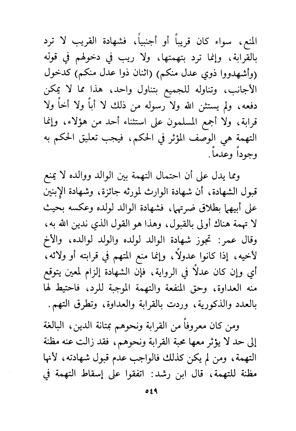 المنع، سواء كان قريبًا أو أجنبيًا، فشهادة القريب لا ترد بالقرابة، وإنما ترد بتهمتها، ولا ريب في دخولهم في قوله: {وَأَشْهِدُوا ذَوَيْ عَدْلٍ مِنْكُمْ} {اثْنَانِ ذَوَا عَدْلٍ مِنْكُمْ} كدخول الأجانب، وتناوله للجميع بتناول واحد، هذا مما لا يمكن دفعه، ولم يسثن الله ولا رسوله من ذلك لا أبًا ولا أخًا ولا قرابة، ولا أجمع المسلمون على استثناء أحد من هؤلاء، وإنما التهمة هي الوصف المؤثر في الحكم، فيجب تعليق الحكم به وجودًا وعدمًا.