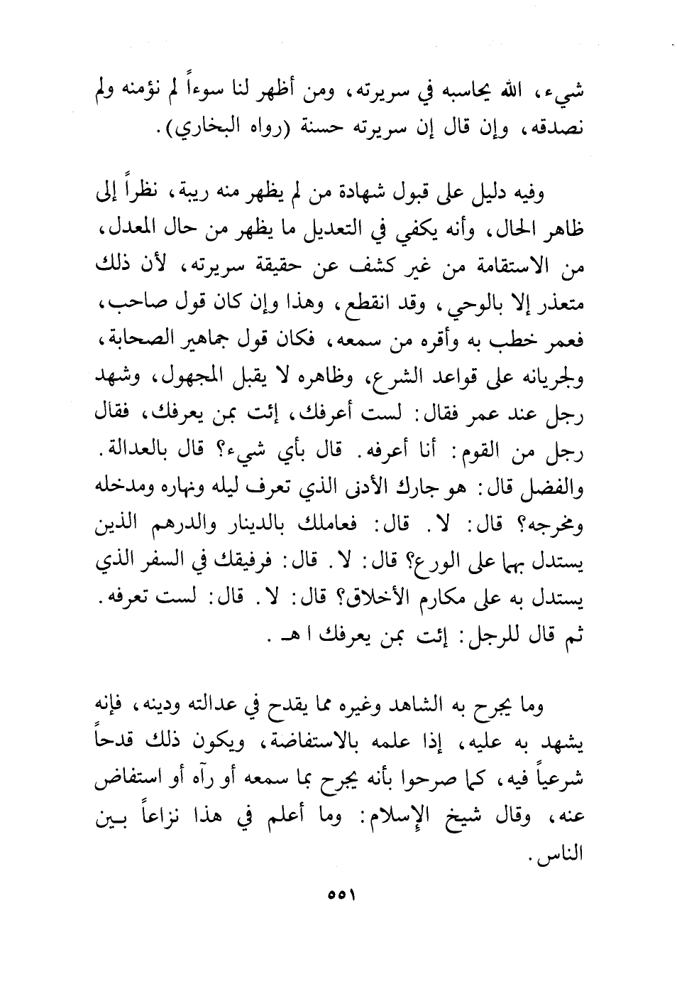 وفيه دليل على قبول شهادة من لم يظهر منه ريبة، نظرًا إلى ظاهر الحال، وأنه يكفي في التعديل ما يظهر من حال المعدل، من الاستقامة من غير كشف عن حقيقة سريرته، لأن ذلك متعذر إلا بالوحي، وقد انقطع، وهذا وإن كان قول صاحب، فعمر خطب به وأقره من سمعه، فكان قول جماهير الصحابة، ولجريانه على قواعد الشرع، وظاهره لا يقبل المجهول، وشهد رجل عند عمر فقال: لست أعرفك، إئت بمن يعرفك، فقال رجل من القوم: أنا أعرفه. قال بأي شيء؟ قال بالعدالة. والفضل قال: هو جارك الأدنى الذي تعرف ليله ونهاره ومدخله ومخرجه؟ قال: لا. قال: فعاملك بالدينار والدرهم الذين يستدل بهما على الورع؟ قال: لا. قال: فرفيقك في السفر الذي يستدل به على مكارم الأخلاق؟ قال: لا. قال: لست تعرفه. ثم قال للرجل: إئت بمن يعرفك اهـ.