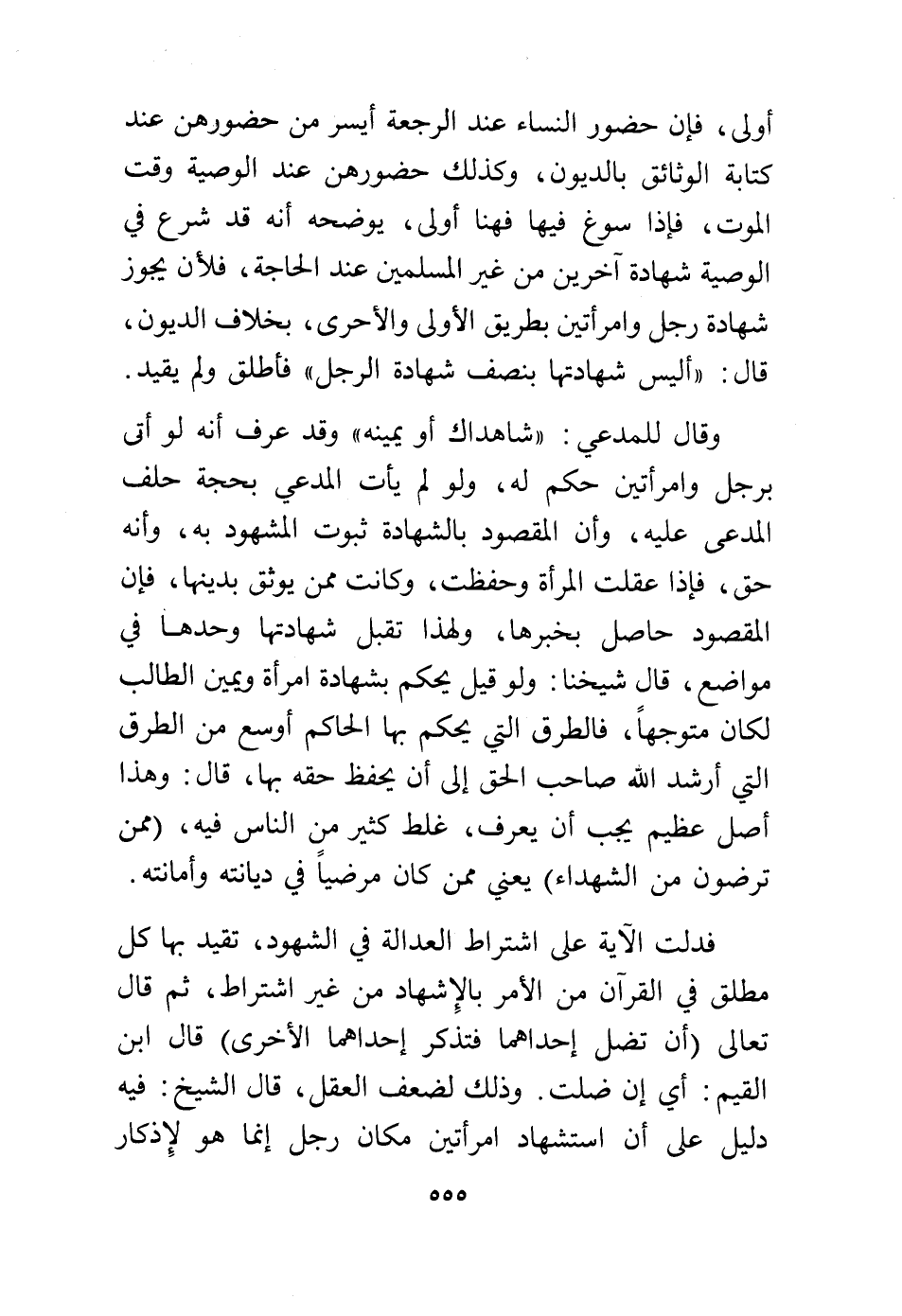 أولى، فإن حضور النساء عند الرجعة أيسر من حضورهن عند كتابة الوثائق بالديون، وكذلك حضورهن عند الوصية وقت الموت، فإذا سوغ فيها فهنا أولى، يوضحه أنه قد شرع في الوصية شهادة آخرين من غير المسلمين عند الحاجة، فلأن يجوز شهادة رجل وامرأتين بطريق الأولى والأحرى، بخلاف الديون، قال: "أليس شهادتها بنصف شهادة الرجل" فأطلق ولم يقيد.