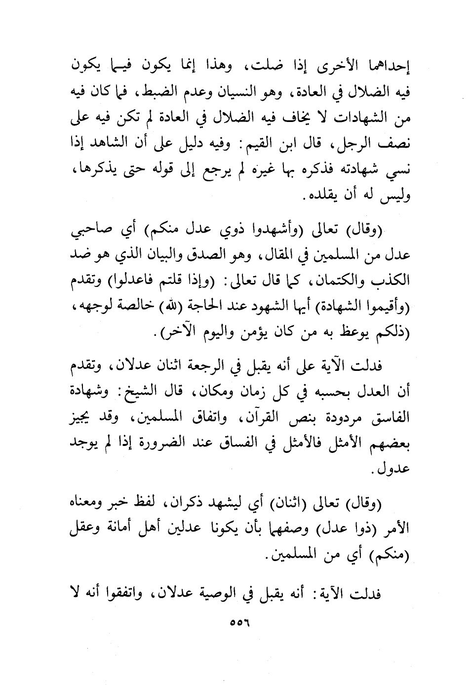 (وقال) تعالى {وَأَشْهِدُوا ذَوَيْ عَدْلٍ مِنْكُمْ} أي صاحبي عدل من المسلمين في المقال، وهو الصدق والبيان الذي هو ضد الكذب والكتمان كما قال تعالى: {وَإِذَا قُلْتُمْ فَاعْدِلُوا} وتقدم {وَأَقِيمُوا الشَّهَادَةَ} أيها الشهود عند الحاجة {لِلهِ} خالصة لوجهه {ذَلِكُمْ يُوعَظُ بِهِ مَنْ كَانَ يُؤْمِنُ بِاللهِ وَالْيَوْمِ الْآخِرِ}.